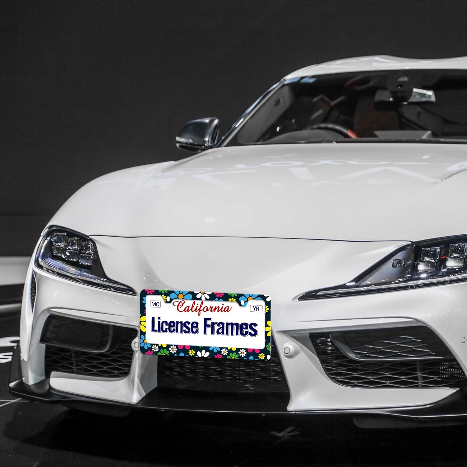 - Standard Size:This 2-hole hippie flowers license plate frame measures 12.3"X 6.3"to fit all standard size U.S.license plates and protects the front and rear panels of the vehicle.The narrow border of the license plate frame hippie does not obscure the status label or cover the state name of the license plate.