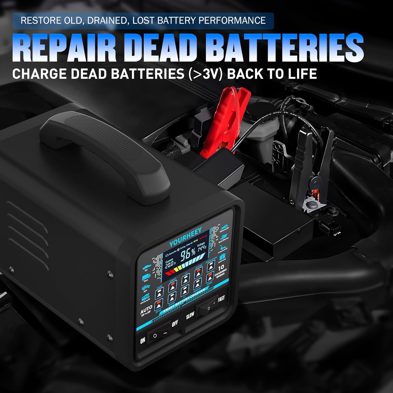 - 【Smart Voltage Detection & Automatic Shutoff】Yourheey's auto battery charger features auto-sensing technology that instantly identifies 12V/24V systems – no manual switching required.Two Charging Rates,Fast charging is generally used for batteries above 30AH, and Slow charging is generally suitable for batteries below 30AH。Auto off mode can stop charging when the battery is fully charged. battery charger for car rv battery charger battery maintainer 12 volt automotive car battery maintainer