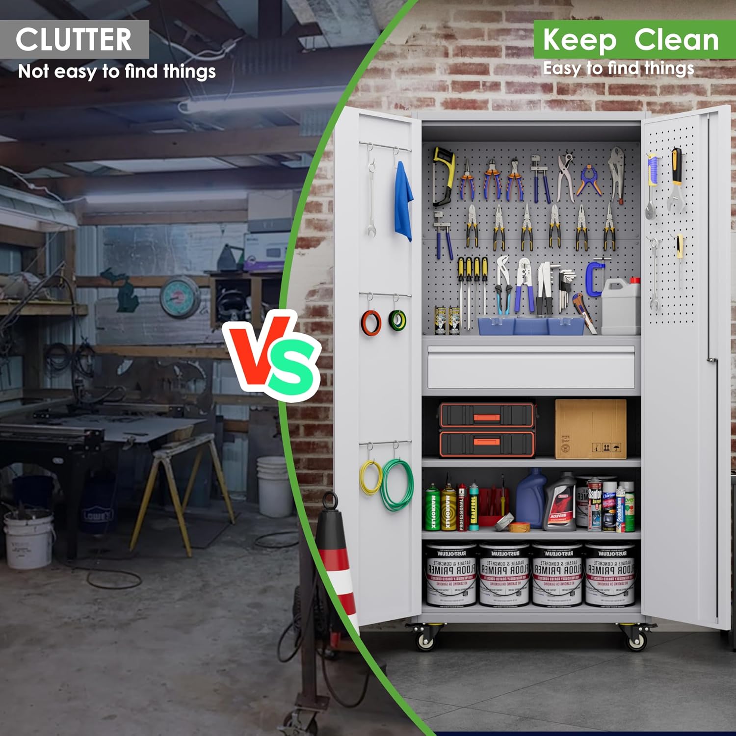 - 16 Hooks and Pegboards:The newly upgraded tool cabinet comes with 10 long hooks and 6 small hooks,3 Metal hanging rod to keep small tools organized, this cabinet maximizes your storage space.