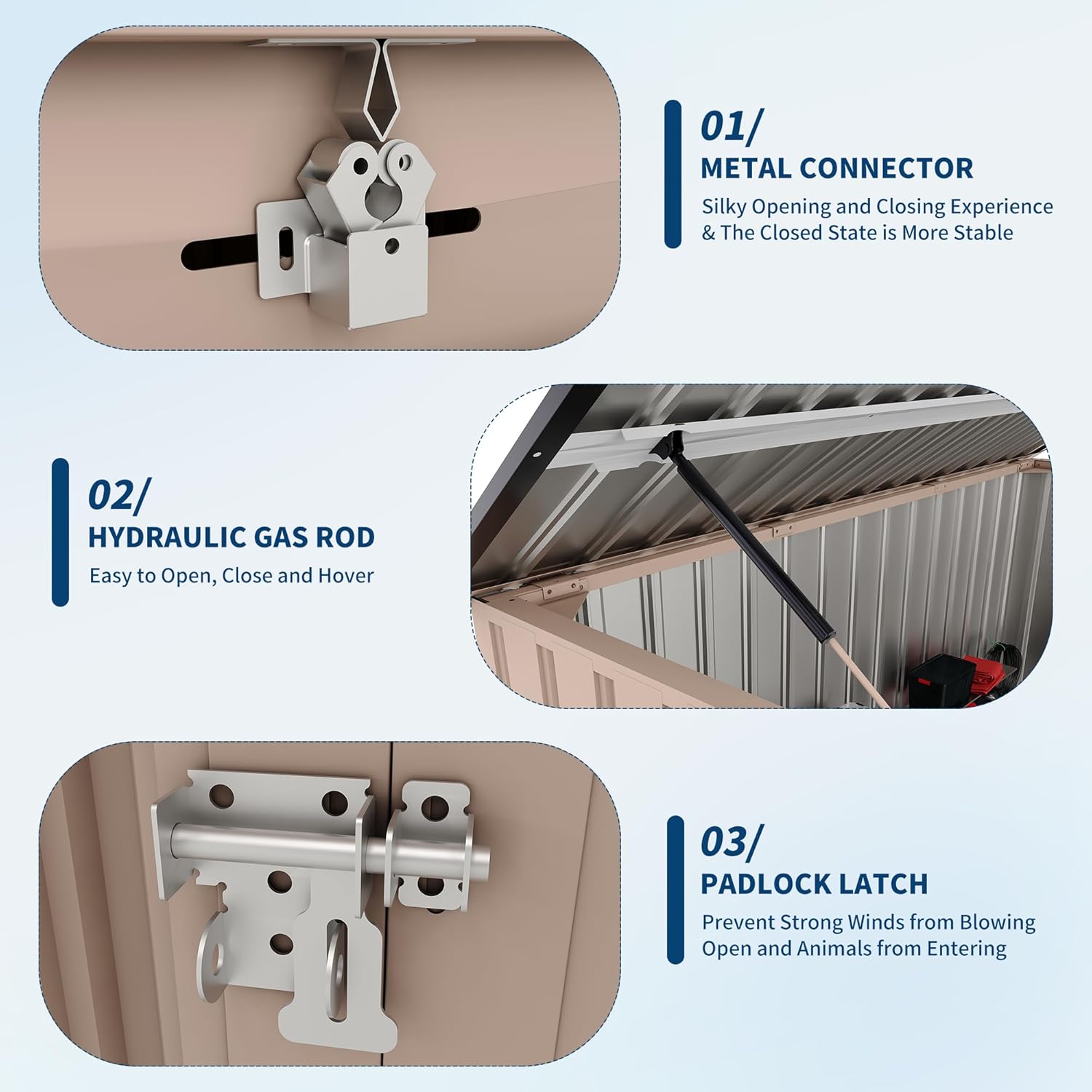 - 2 CHAINS & AIR VENTS DESIGN - This garbage bin shed stores has a preset iron chain hole on the cover, which can be linked to the trash can cover with an iron chain. In addition, the top cover can be held in mid air without the need to be lifted by hand, as it is equipped with a high quality, long life pneumatic rod. It opens the trash can simultaneously, which is convenient for dumping garbage. Equipped with 2 vents, it facilitates air circulation, preventing excessive humidity in hot or humid w