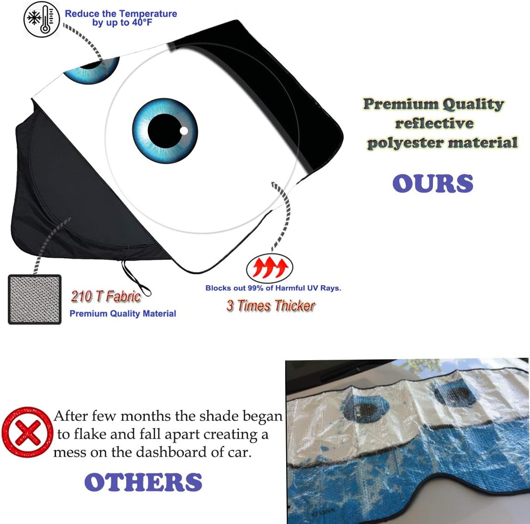 - Funny Eyes Design Makes Your Vehicle Special under Sunshine. Funny visor reflects personality and attitude. Get rid of miserable with your car from harmful UV radiation rays.