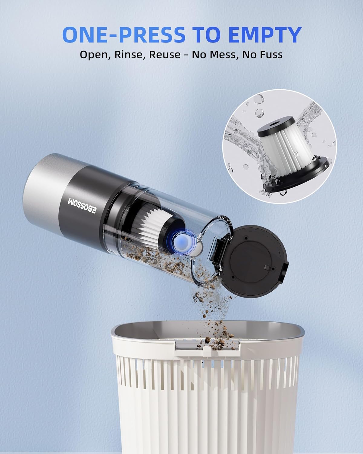 - LARGE DUSTBIN CAPACITY:This mini vacuum cleaner features a 160ml dustbin that’s perfectly sized for a full cleaning session. With the one-click release, you can empty it in seconds—no need to touch the dirt. The washable filter is easy to clean, with extra HEPA filter available, you don't need to worry about the replacement