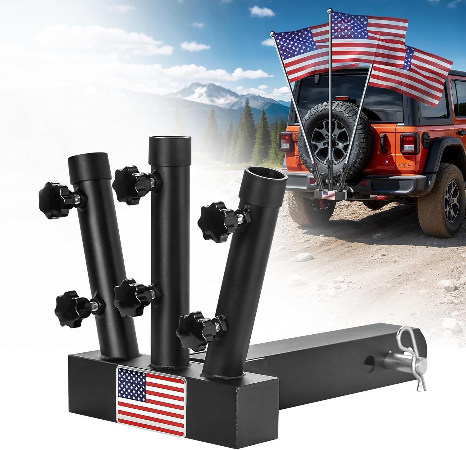 Heavy Duty Three Hitch Flag Holder, Trailer Hitch Flag Pole Holder, Fits 2" Trailer Receivers, Universal Hitch Flag Pole Holder Kit with Cars, Trucks, SUV, Pickups, Campers & Trailers