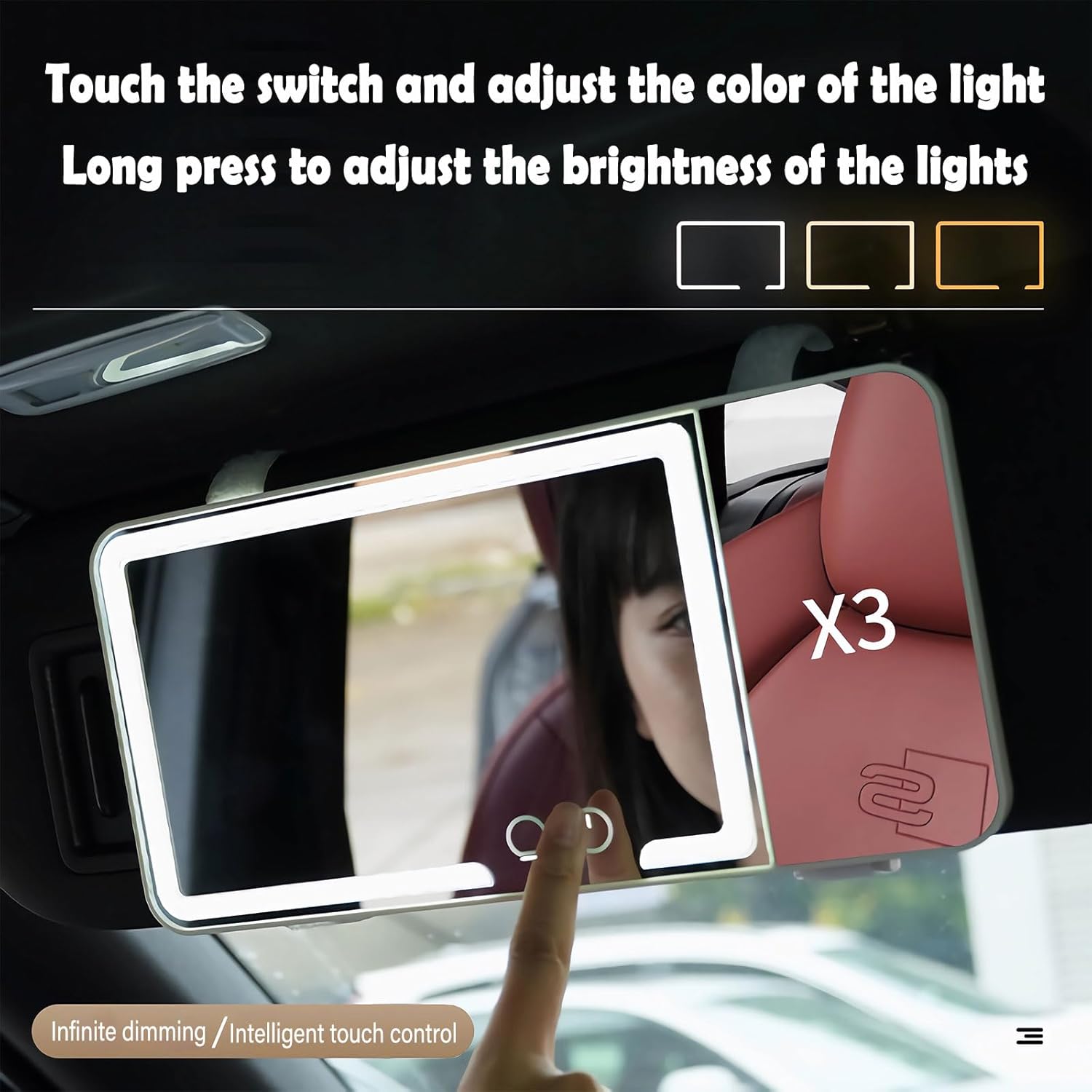 - 【DIMMABLE BICOLOR LED LIGHTS】The car makeup mirror has 60 led lights, which is 40% brighter and 60% less energy than normal bulbs. Long press for dimming according to what you need. 2500k-6500k color temperature meets the needs of different makeup occasions/night lighting