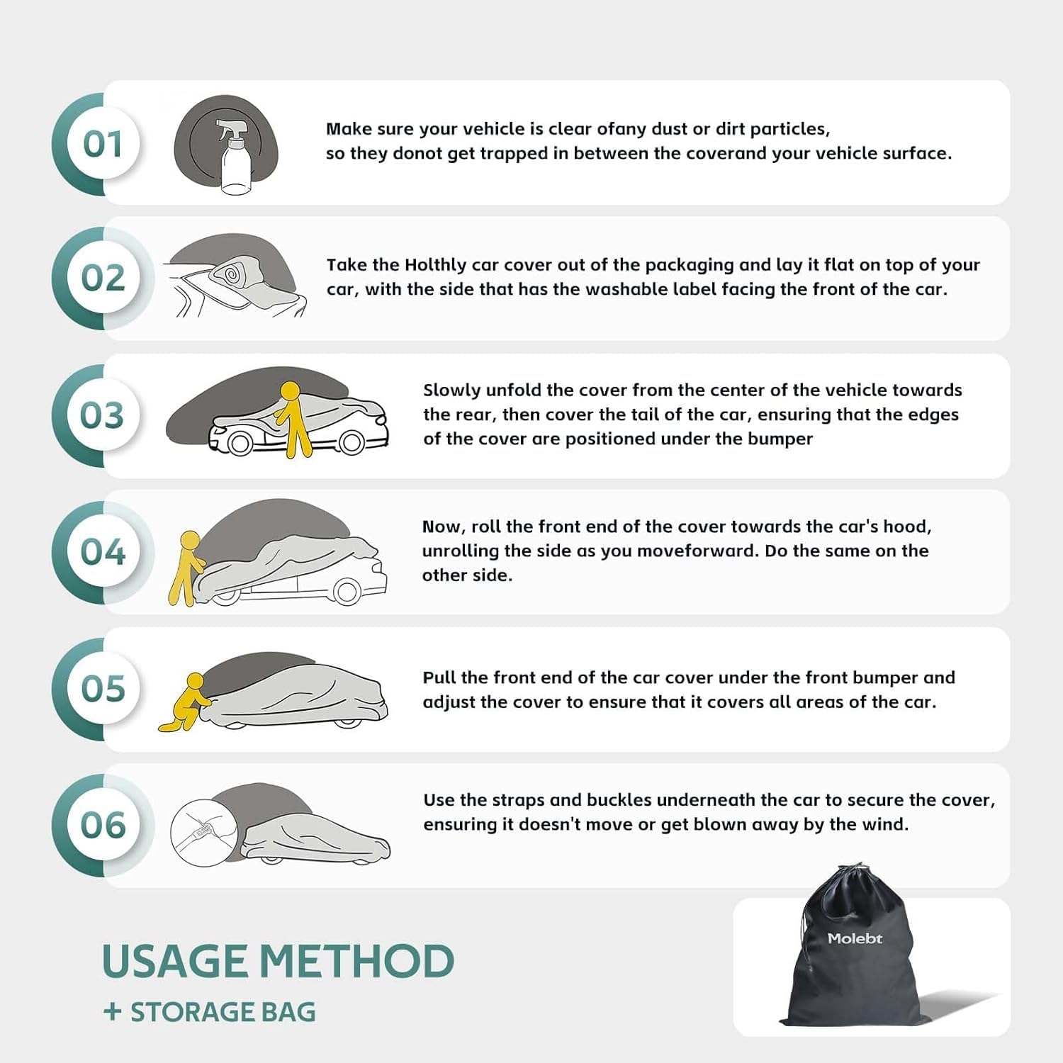 - ăFOUR SEASON PROTECTIONă:Molebt rainproof car cover provides all weather full protection for your vehicle in spring, summer, autumn, and winter: dust, snow, industrial pollution, bird droppings, leaves, pollen, acid rain, UV rays, scorching sun, torrential rains, and more.