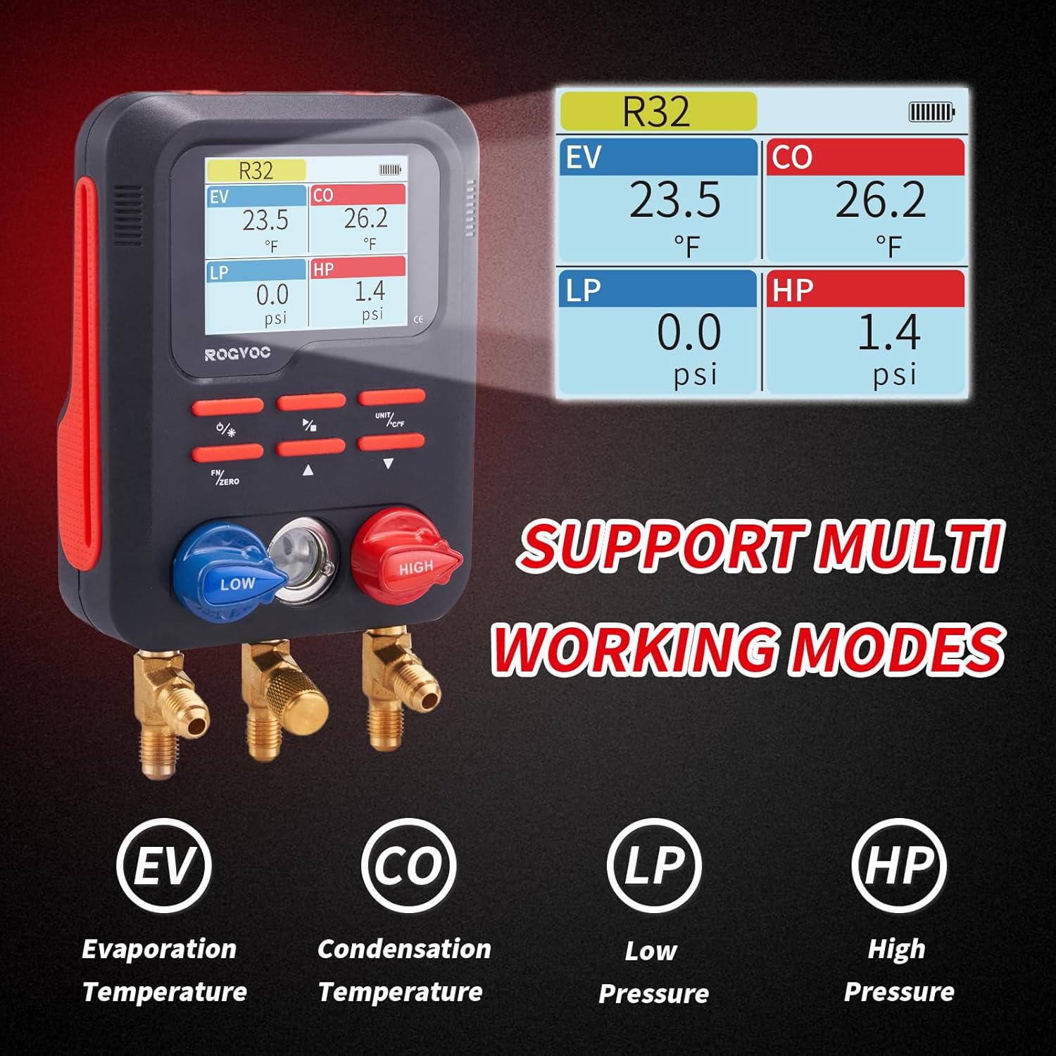 - DIGITAL MANIFOLD GAUGE SET: Rogvoc manifold gauges have functions such as refrigerant filling, dual pressure and air tightness test, vacuum degree test, temperature test, condensation evaporation pressure, etc. Built-in 93 types of refrigerant data can be switched or filled with different types of refrigerants according to needs. The 32-bit digital precision data acquisition unit has good data stability, making the pressure data measurement more stable and accurate.