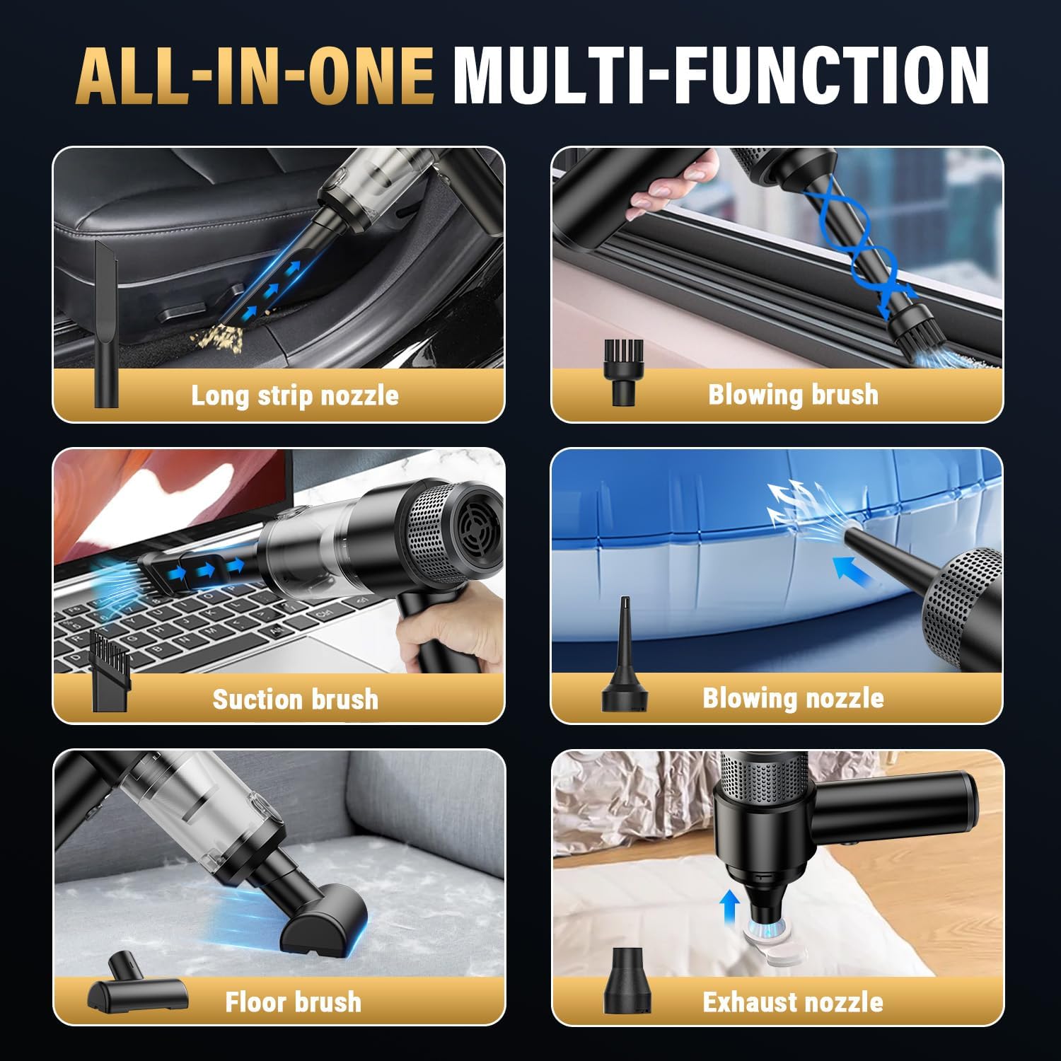 - 【4in1&Versatile Cleaning Companion for Every Scenario】Transform your cleaning routine with this multi-functional handheld vacuum designed to tackle diverse tasks effortlessly. Beyond standard debris pickup, its innovative design allows you to blow away dust from keyboards, shelves, and tight corners, or even inflate balloons, airbeds, and pool toys in seconds. Perfect for indoor and outdoor use, it transitions seamlessly from vacuuming pet hair on carpets to clearing workshop sawdust or refreshing your car’s interior. Its optimized airflow system ensures efficient performance across all functions without manual adjustments
