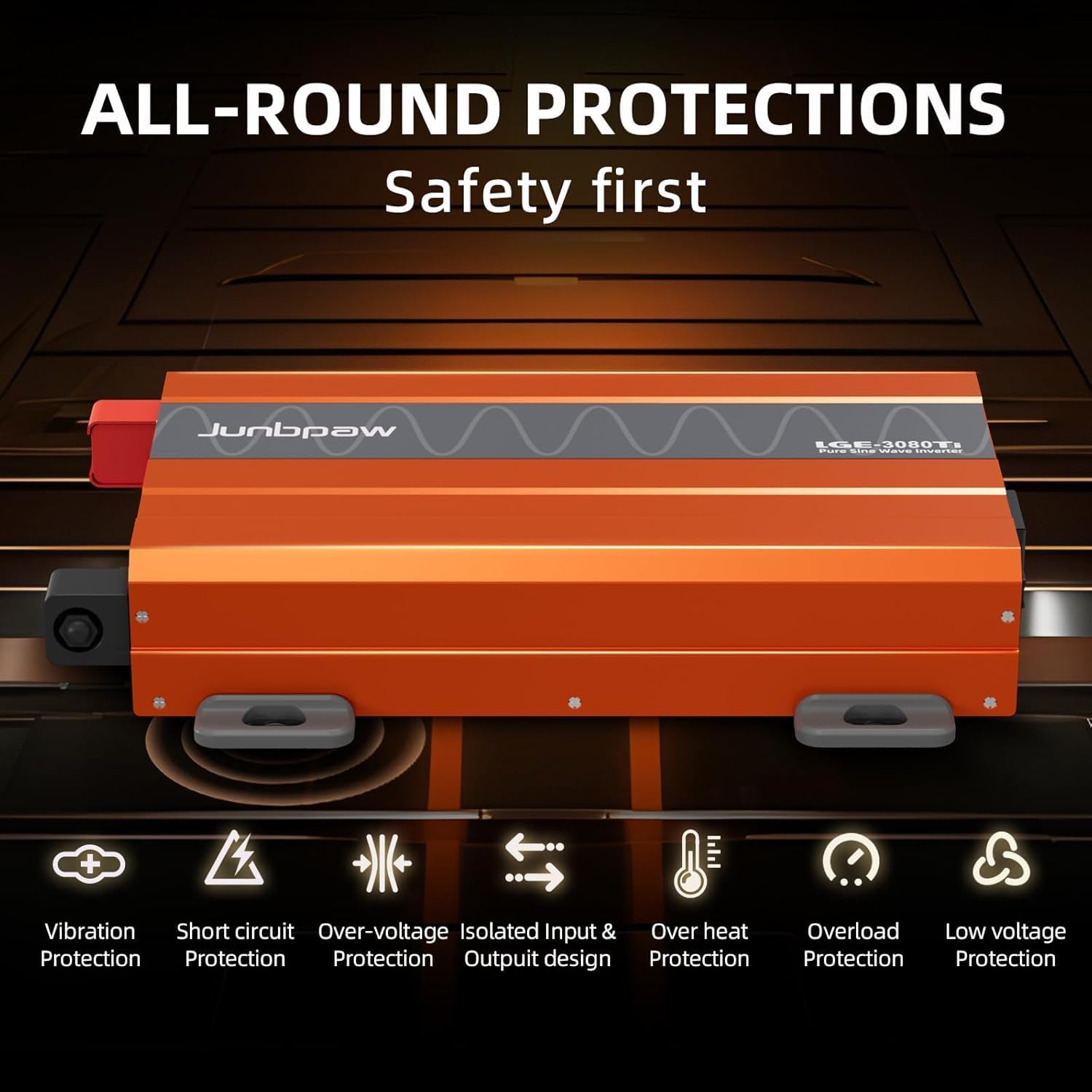 - 3080 Watt Pure Sine Wave Inverter: The Junbpaw inverter utilizes advanced pure sine wave technology to deliver stable AC power, equivalent to grid quality, safeguarding and prolonging the lifespan of your electronics and appliances.