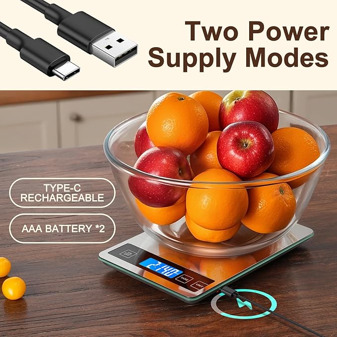 - [ Dual Power Supply ]: This food scale contains a built-in lithium battery that can be charged via a USB cable, you can also use AAA batteries. Accessories: USB cable, AAA battery*2