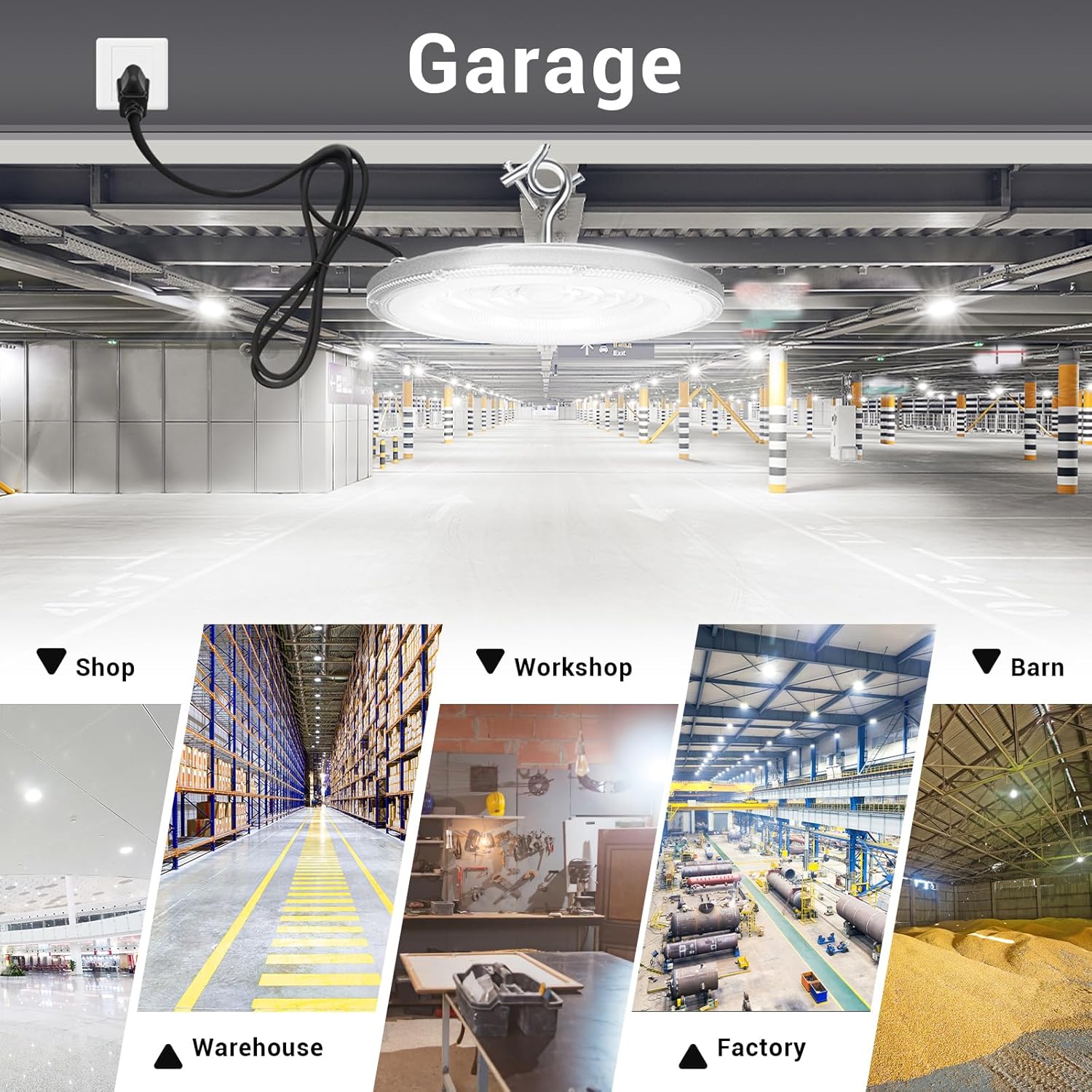 - 【Easy & Quick Installation】This UFO Led High Bay Light can be easily installed in seconds with the 5FT power cord provided and the built-in hook. It comes with US plug with which you can plug to the power directly, safe and secure for extremely easy installation. Ideal indoor lighting,This LED highbay light can work under power supply of AC 120V.