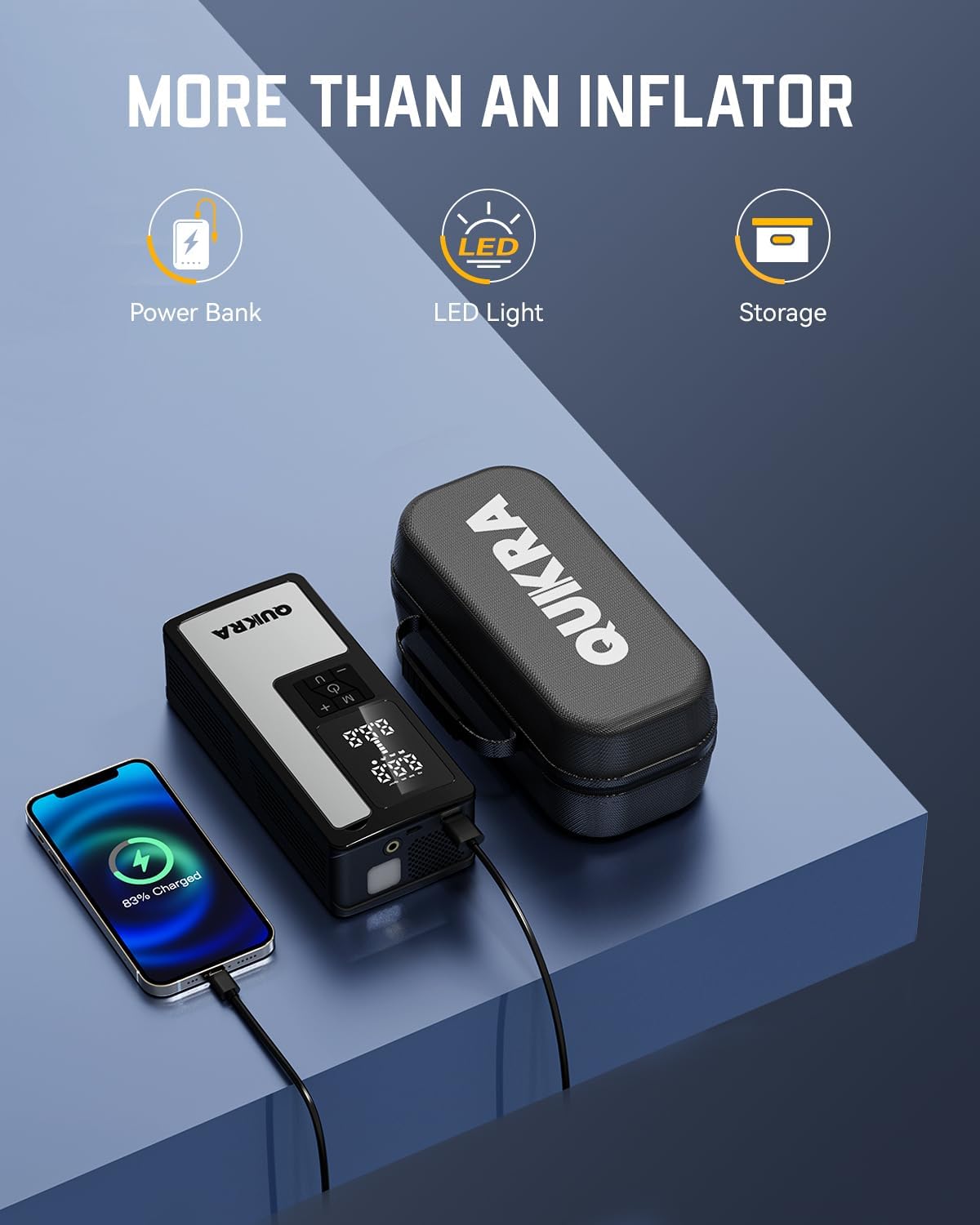 - [Package Include]: Smart portable tire inflator P009*1, storage bag*1, storage box*1, air hose*1, USB charging cable*1, long inflation nozzle*1, short inflation nozzle*1, french valve adapter*1, ball needle*1, service manual*1. If you have any questions, we are here to help you, QUIKRA devoted to provide premium product and customer-satisfying service