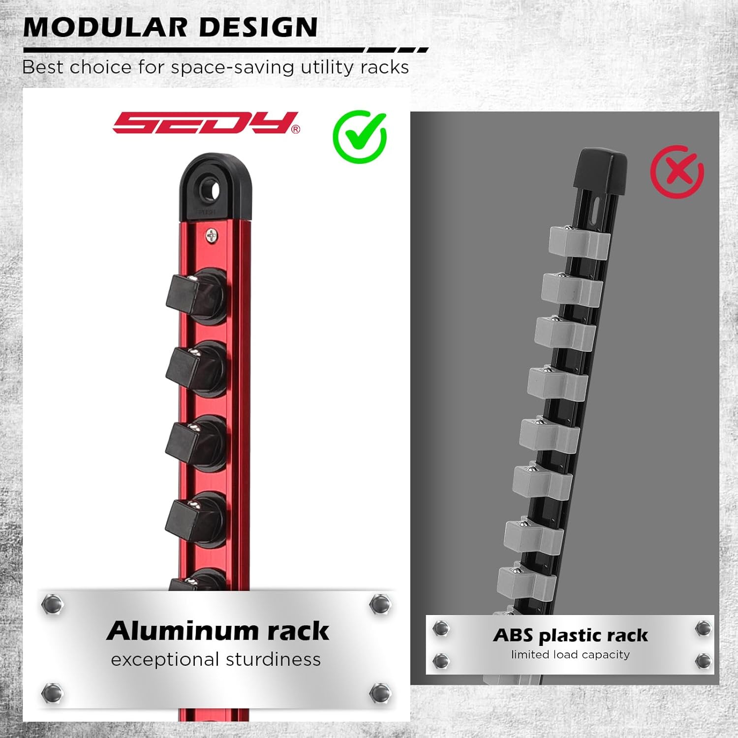 - VERSATILE STORAGE - Magnetic back and hanging holes enable attachment to any metal surface, wall or tool cart this aluminum kit offers a versatile garage storage solution for impact sockets and SEDY-approved organization