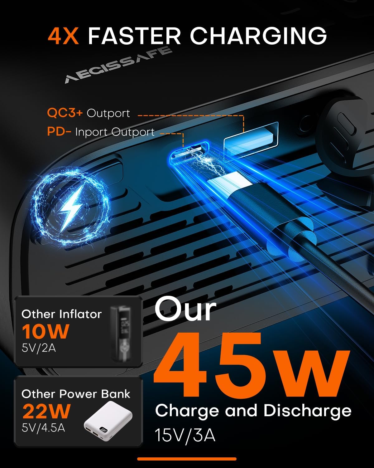 - ⚡【45W Super Fast Charging】As a mobile power supply, equipped with 45W USB-C input and output port and 45W USB-A output port, which can quickly charge the other electronic devices; the power supply speed is 3 times faster than 99% of the air pumps on the market and 2 times faster than most mobile power supplies. car tire pump supports a maximum charging input of 45W and can be fully charged in 2 hours.