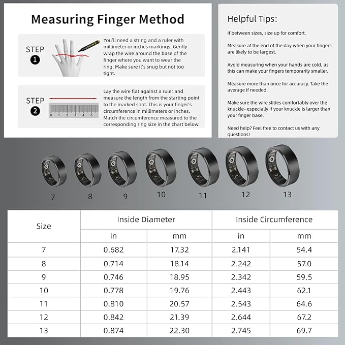 - 【Size Before You Buy】Before purchasing the Smart Ring, we highly recommend referring to the size chart and measuring your finger circumference to ensure the most comfortable fit and avoid unnecessary returns or exchanges