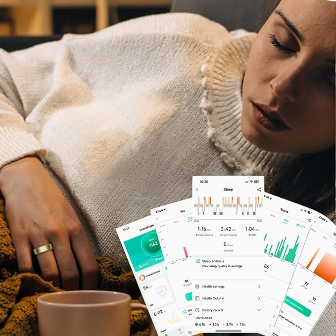 - 【Intelligent Sleep Tracker】The fitness ring automatically monitors your sleep quality. It can record deep & light sleep duration, eye movement, and wakefulness. You can view various indicators anytime in the app and adjust your lifestyle based on reports