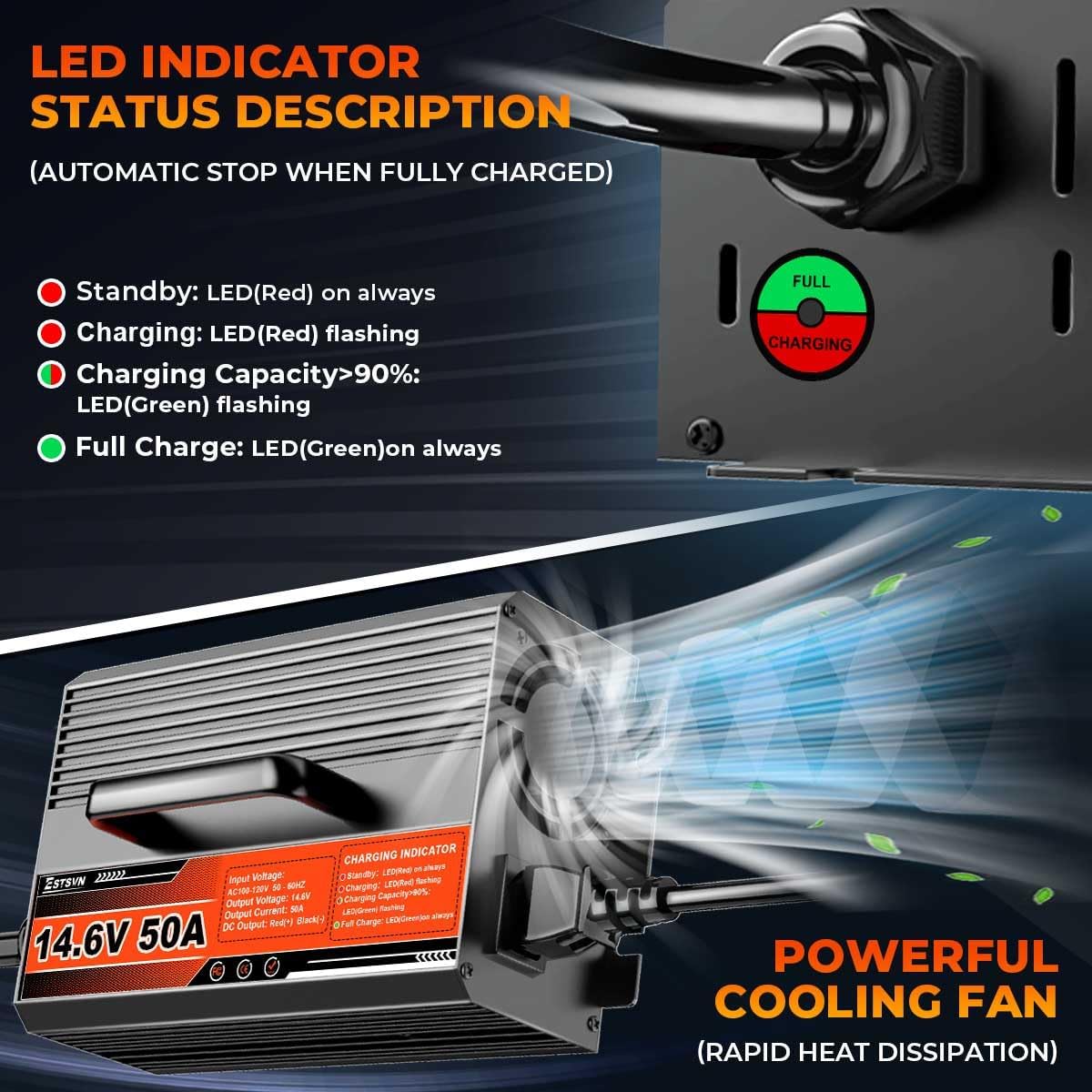 - 🚌【50Amp 12V Fast Battery Charger】: Our 12V (14.6V) 50A LiFePO4 lithium battery charger, charging voltage: 14.6V, charging current: 50A, input voltage: 100V-120V AC; 50Hz to 60Hz.Meanwhile, aluminum body and large cooling fan make the heat dissipation more efficient, reducing power waste and improving charging efficiency.And supporting a 0V charging function to reactivate the battery.