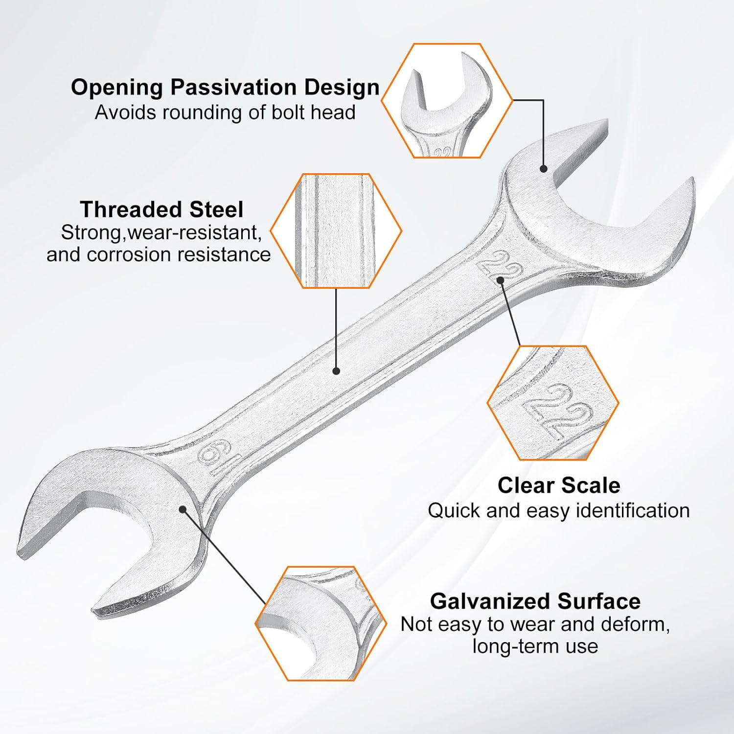 - Material - Our double open-end wrench is made of threaded steel with high hardness and excellent wear resistance. The surface galvanizing improves its wear resistance, keeps its surface smooth and reduces wear, is not easy to deform, and can be used for a long time.