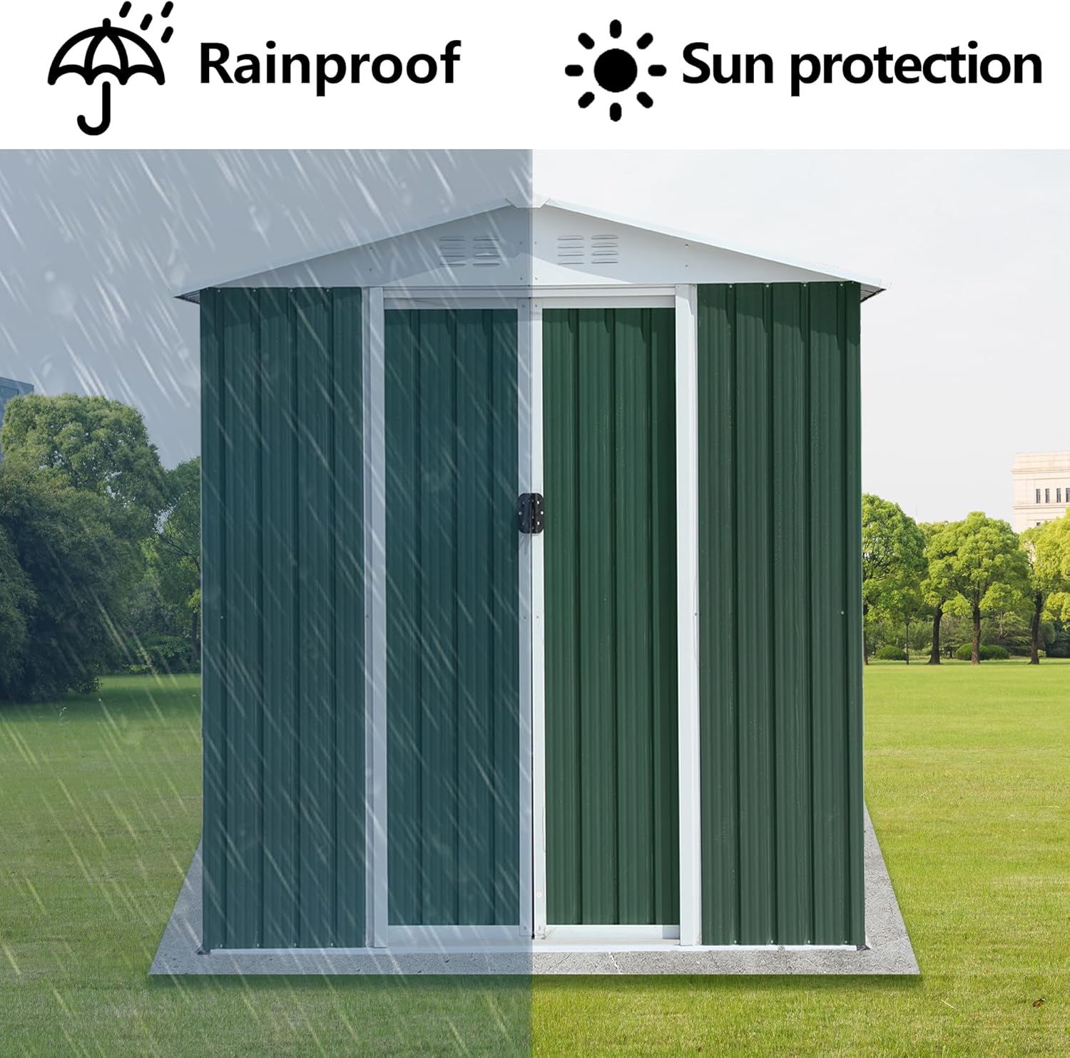 - ๐ก๐๐ฅ๐ฅ-๐ฐ๐๐๐ญ๐ก๐๐ซ ๐๐ญ๐จ๐ซ๐๐ ๐ ๐๐ก๐๐: Our metal shed 6x4 features smooth, lockable sliding doors with handles for easy opening and closing. It serves not only as a safe space for storing garden tools but also as a warm pet house. The sloped roof of the storage building effectively prevents leaks and snow accumulation, while the four integrated punched vents improve airflow, helping to keep your items dry