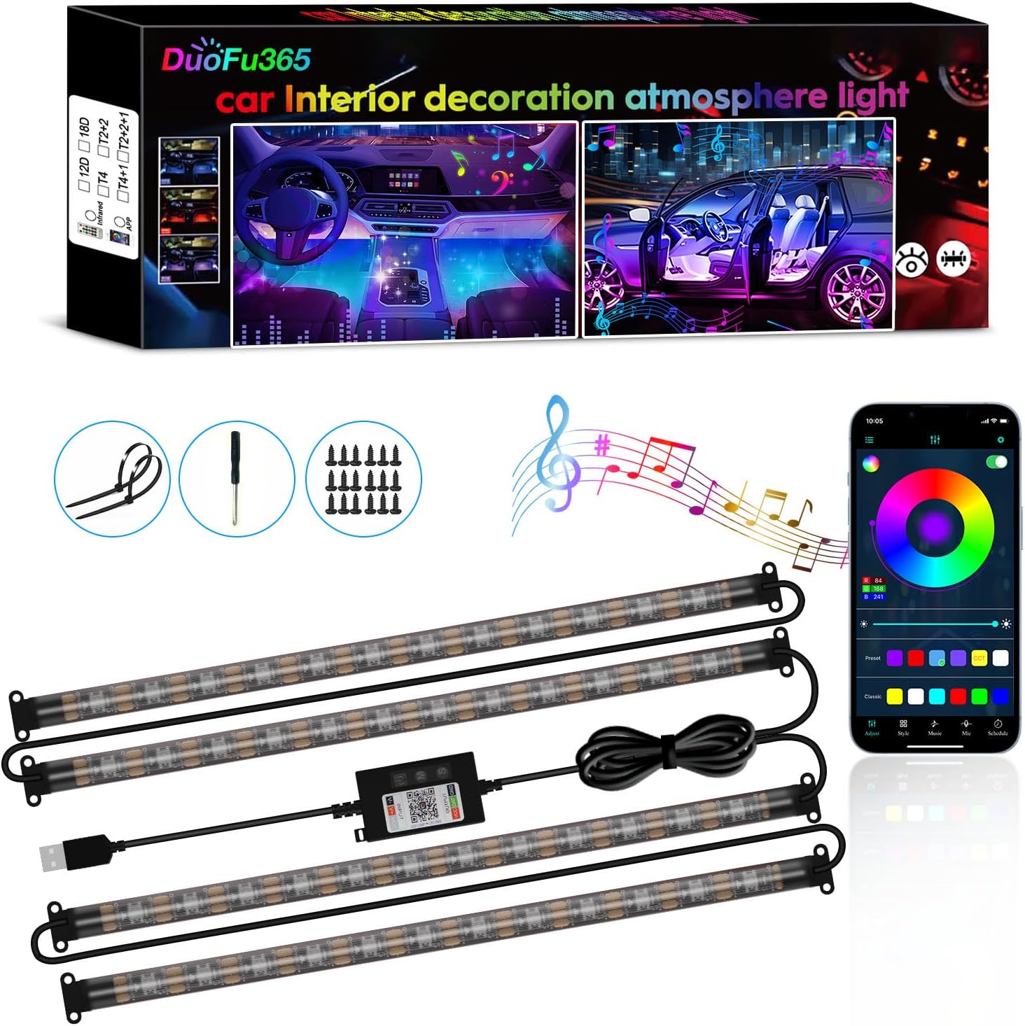 - ăMulti Color & DIY Music SyncăOver 16 million colors.Led lights for car has built-in mic helps interior car lights sync with any music type, then the interior lights will change their colors following the music rhythm.Make your car stand out in unique style with creative freedom.