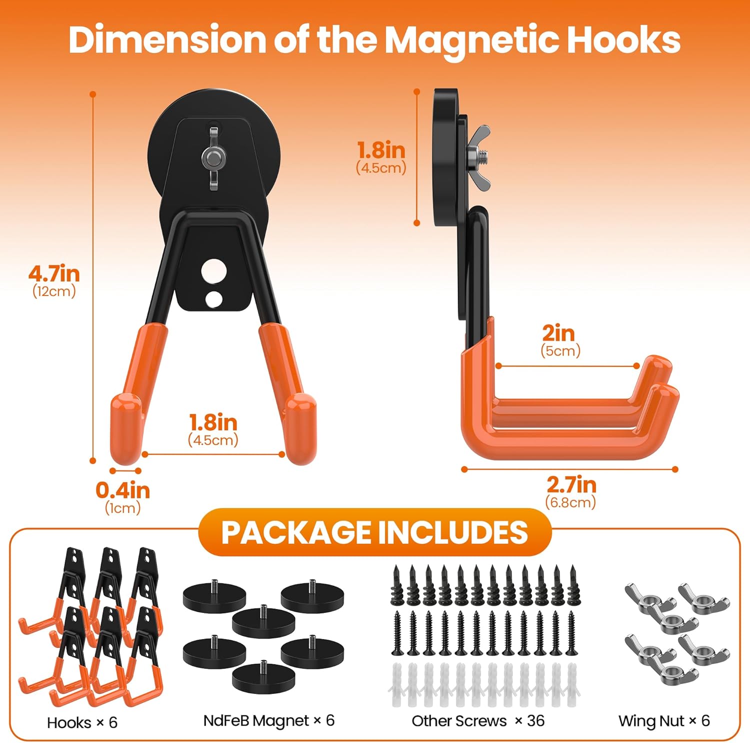 - 【Multi-Pack Magnetic Hooks Heavy Duty】 Our strong magnetic utility hooks are upgraded with high-performance neodymium magnets, offering a versatile storage solution for homes, garages, workshops, kitchens, gardens, and more. With 6 Pack large magnetic hooks in one set, they meet daily storage needs for both light and heavy items, keeping your space organized and clutter-free