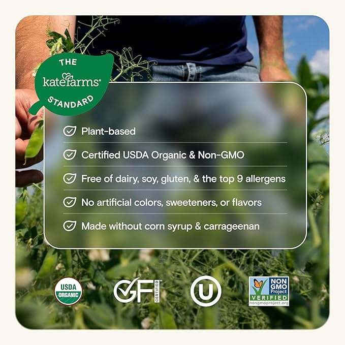 - Crafted to meet the Kate Farms Standard: Our promise for honest goodness. Every shake is plant-based, Certified USDA Organic, and Non-GMO Project Verified. It’s made without dairy, soy, gluten, or the top 9 common allergens, and contains no artificial colors, sweeteners, or flavors. We also leave out corn syrup and carrageenan—because real nutrition should be simple and trusted.