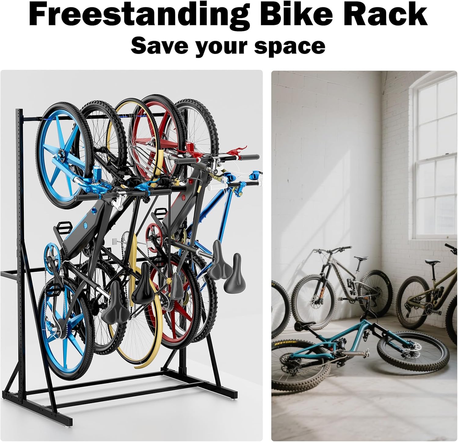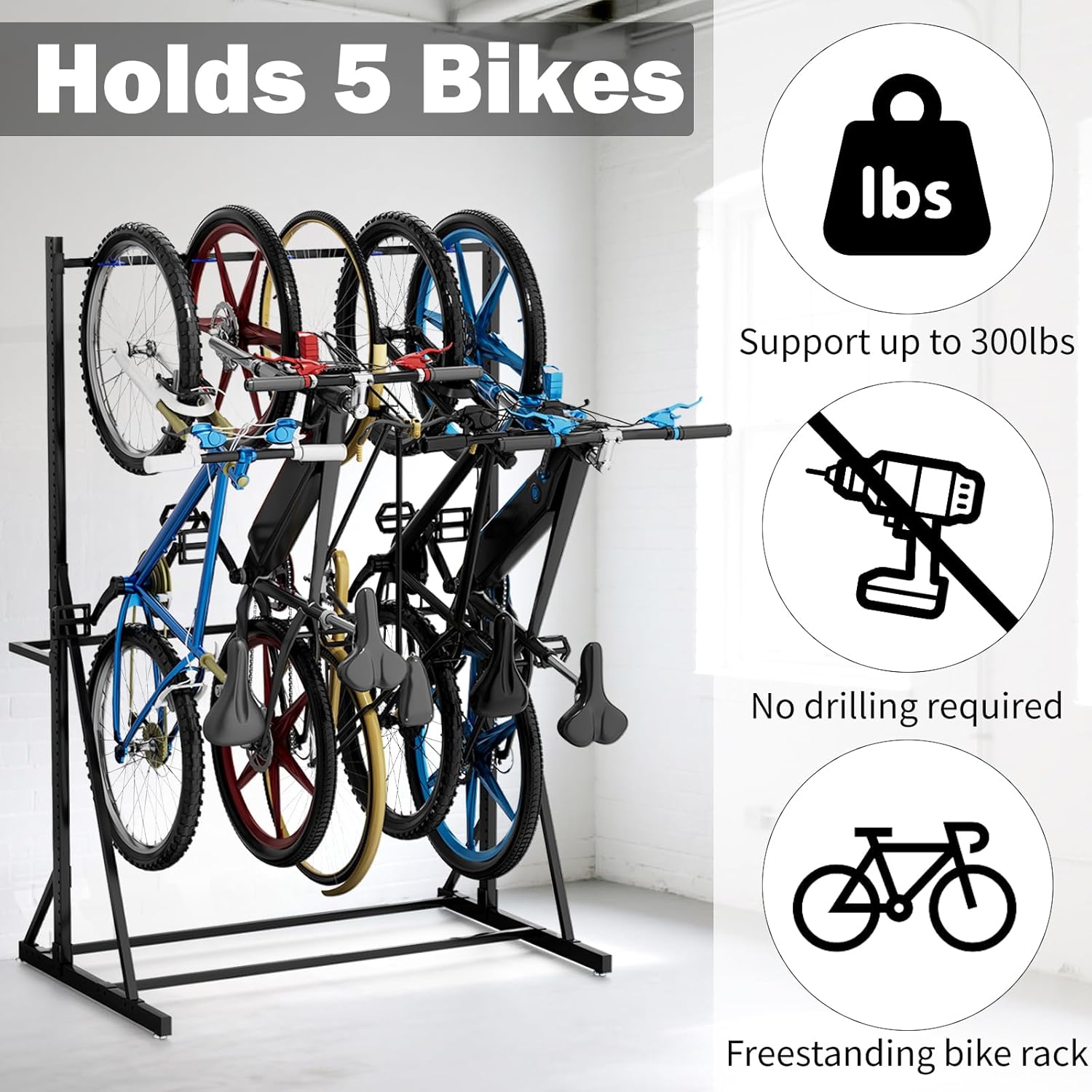 - Freestanding & No Drilling Installation: Bike rack garage holds 5 bikes weighing up to 300 pounds securely without wall-mounting or drilling, ideal for garages, sheds, and apartments where wall space is limited—keeps bikes organized and off the floor.