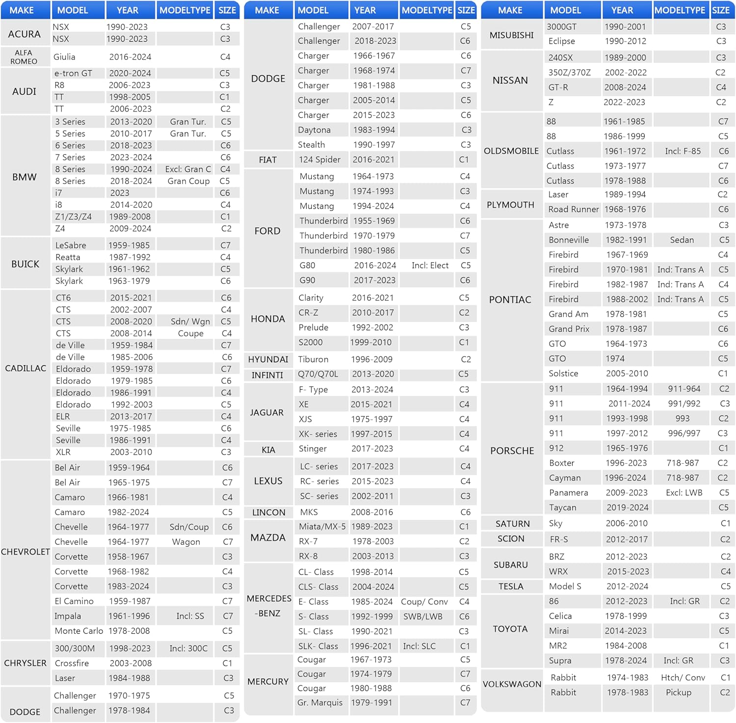 • Coverage : Full exterior coverage for cars (e.g., Audi e-tron GT, BMW 3/5 Series, Dodge Challenger/Charger) with size compatibility (C5) Full exterior coverage for cars (e.g., Audi e-tron GT, BMW 3/5 Series, Dodge Challenger/Charger) with size compatibility (C5)