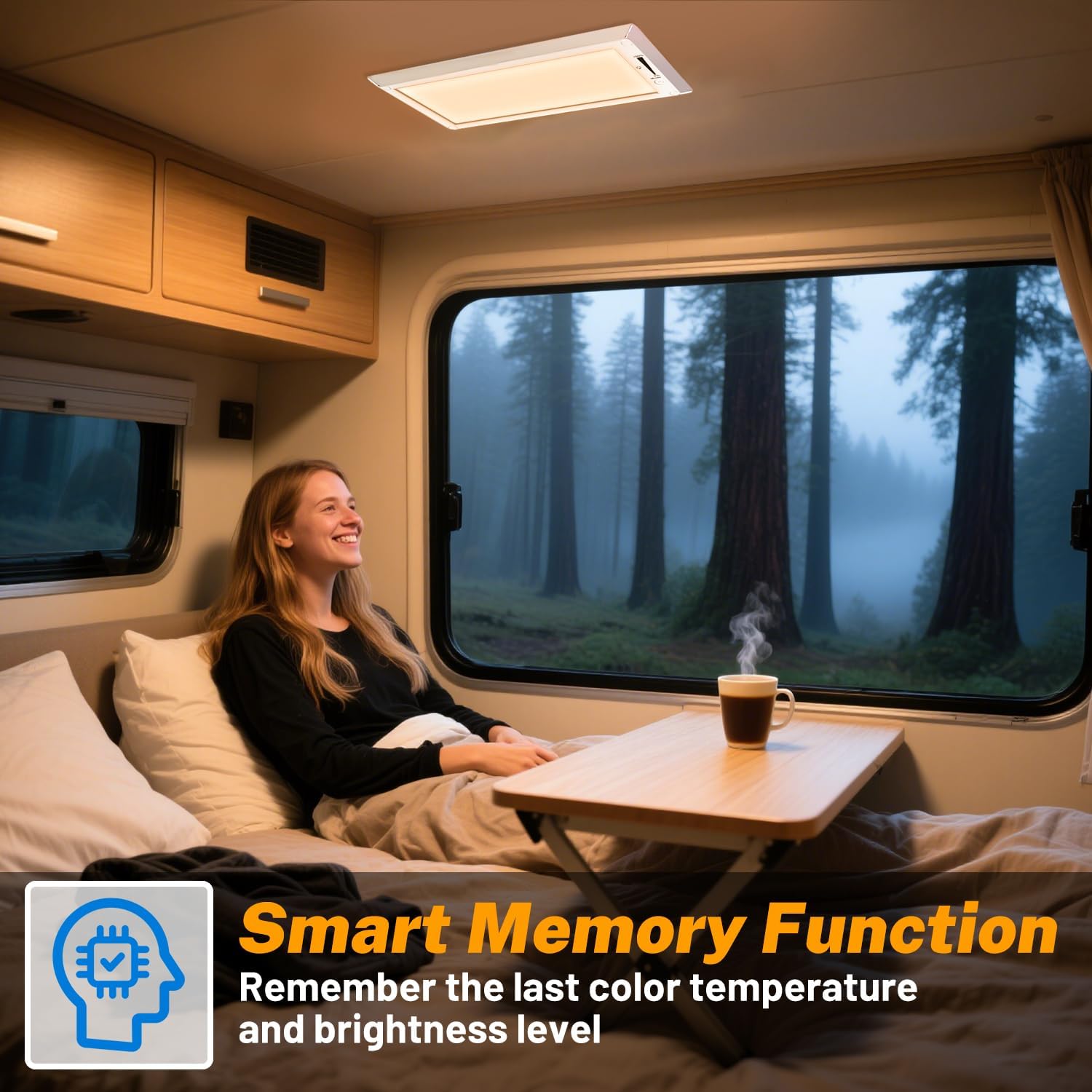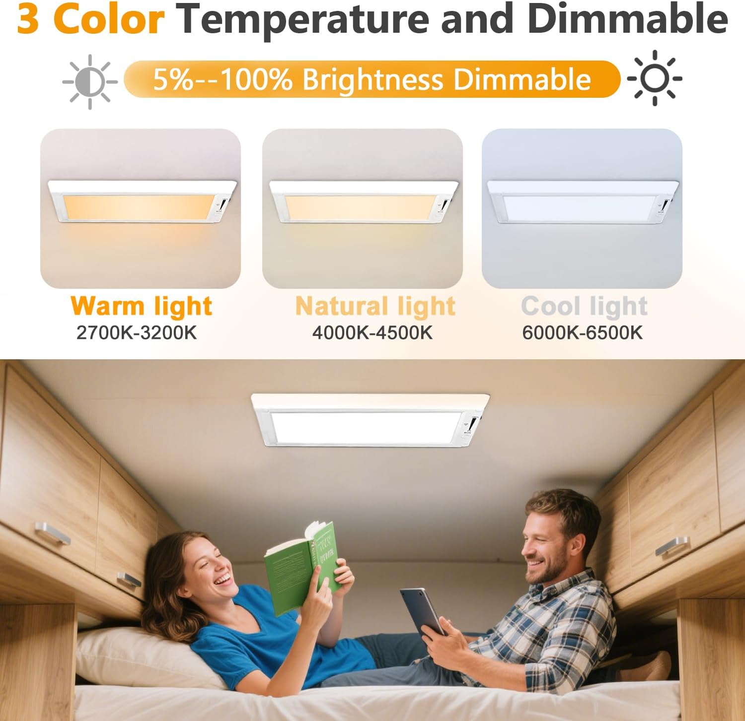 - Sleek Stylish Design&Memory Function:The RV ceiling light has an Ultra-Thin design, measuring 5.5*11.8*0.5in, with a sleek ABS silver shell that exudes a modern and minimalist aesthetic.The RV ceiling light fixtures feature smart memory function, seamlessly restoring your chosen color temperature and brightness settings every time they are turned on.Say goodbye to the hassle of readjusting lights every time you turn them on, Saving Your Precious time And Energy For The Adventures That Await.