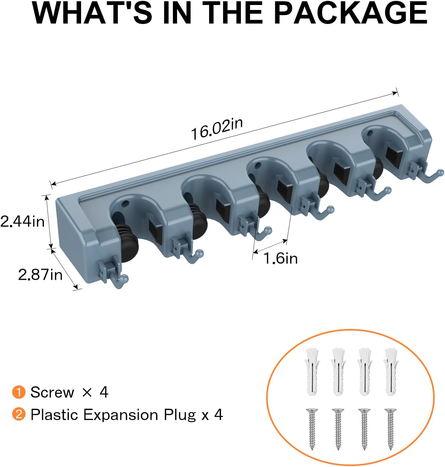 - CLEANING TOOLS STORAGE RACK: This wall mounted broom rack is suitable for storing cleaning supplies, gardening tools, kitchen utensils and hardware tools. Our broom rack is the best companion for your kitchen, garage, laundry room, keeping your work area clean and tidy