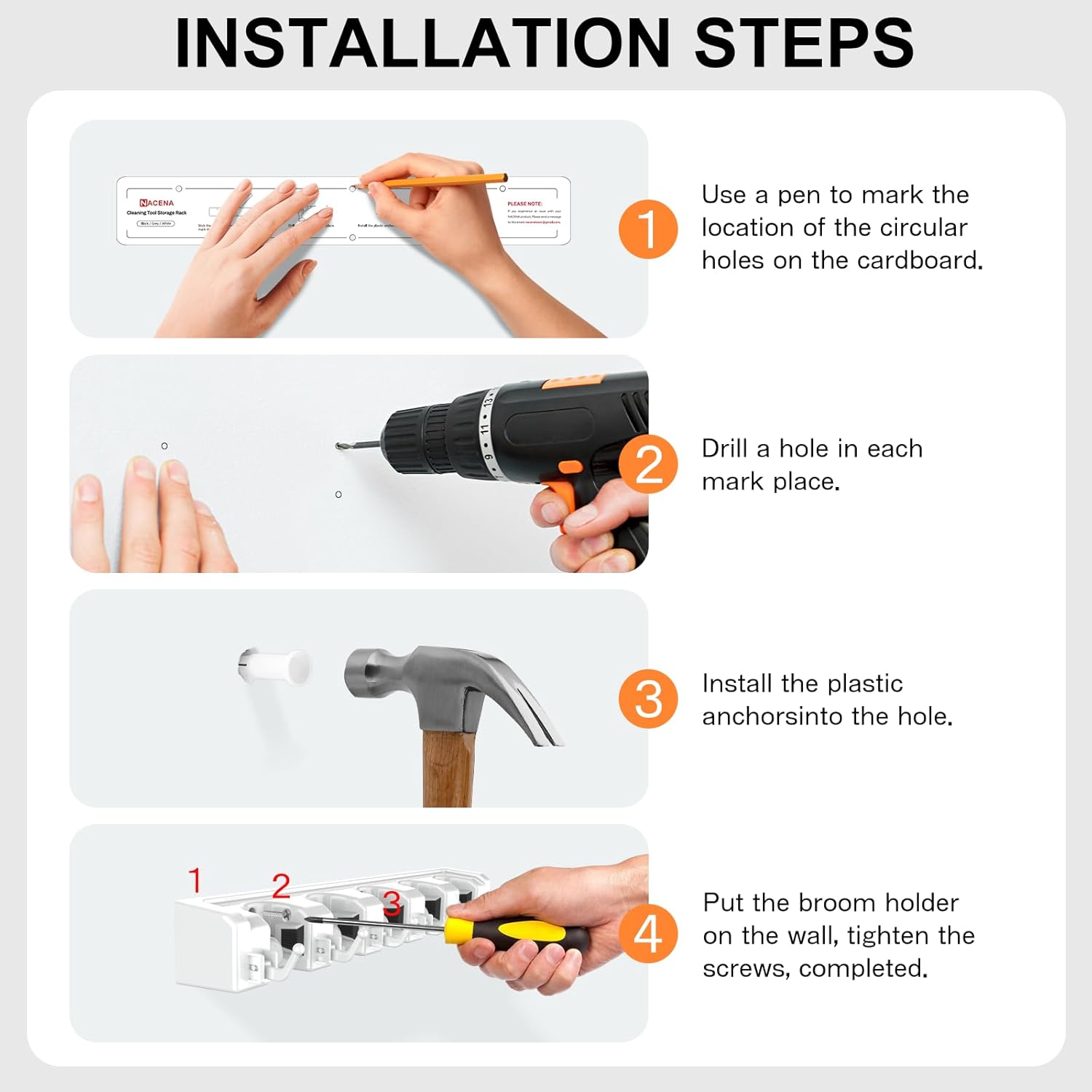 - CLEANING TOOLS STORAGE RACK: This wall mounted broom rack is suitable for storing cleaning supplies, gardening tools, kitchen utensils and hardware tools. Our broom rack is the best companion for your kitchen, garage, laundry room, keeping your work area clean and tidy