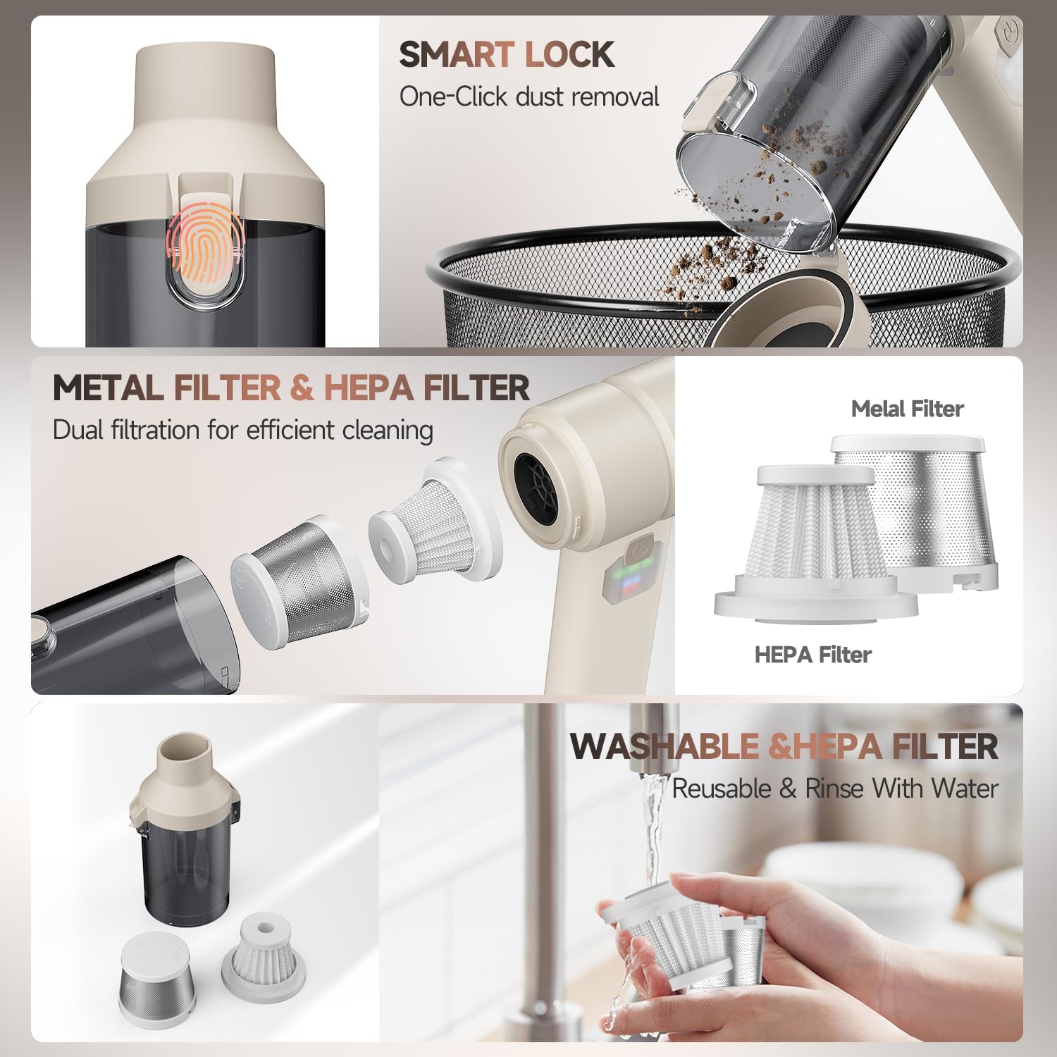 - ăDual Filtration System & one-click to EmptyăCar vacuum portable cordless cleaner comes with an upgraded dual filtration system. The HEPA filter fine dust during use and can be easily washed and reused. Metal filters effectively filter out large particles of debris to prevent damage to the cordless handheld vacuum. One-click dust removal design, just one click, the garbage can be emptied smoothly without dirty hands.