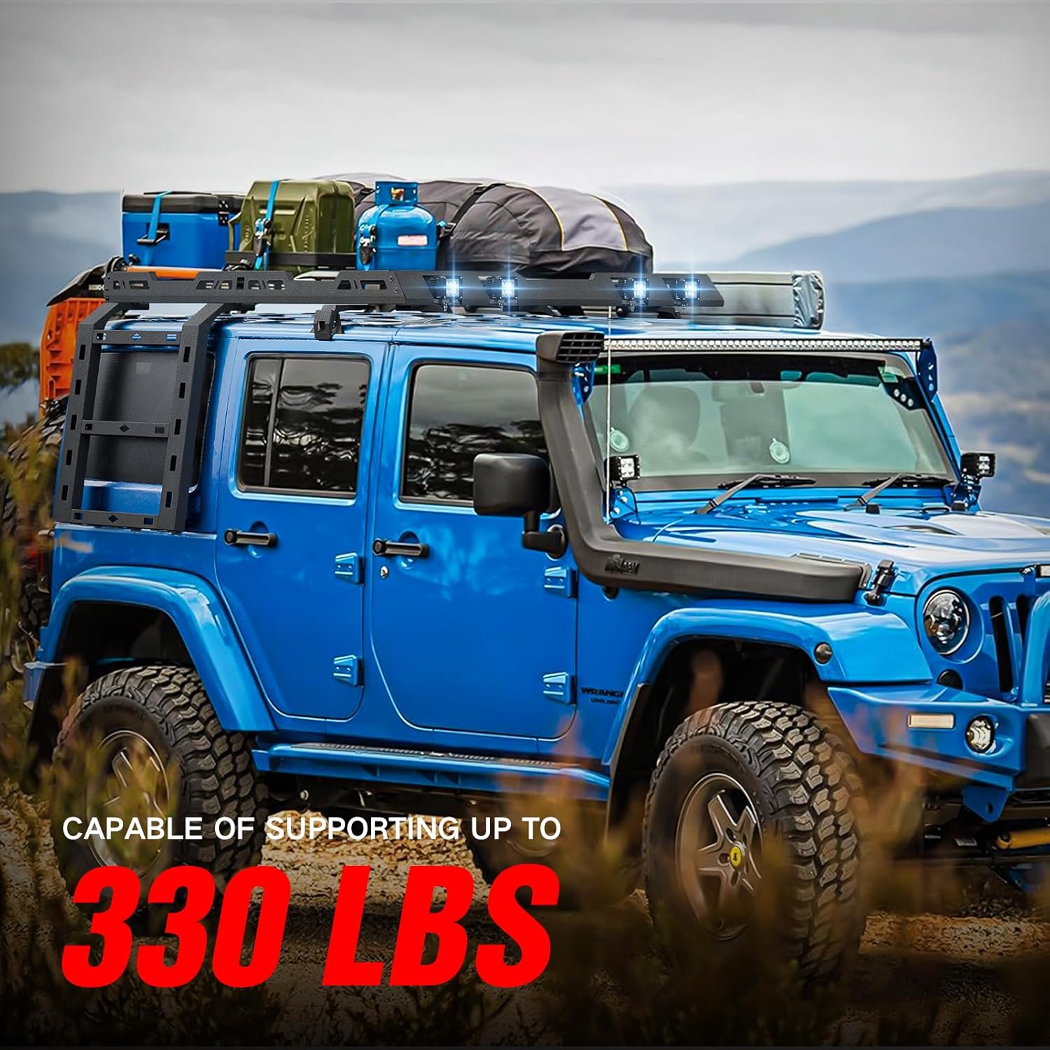 - ăHigh Load Capacityă: Provides additional cargo space for your JK JKU Unlimited with a load capacity of 330 pounds, catering to various carrying needs such as camping gear, off-road equipment, bicycles, travel cargo, and more.