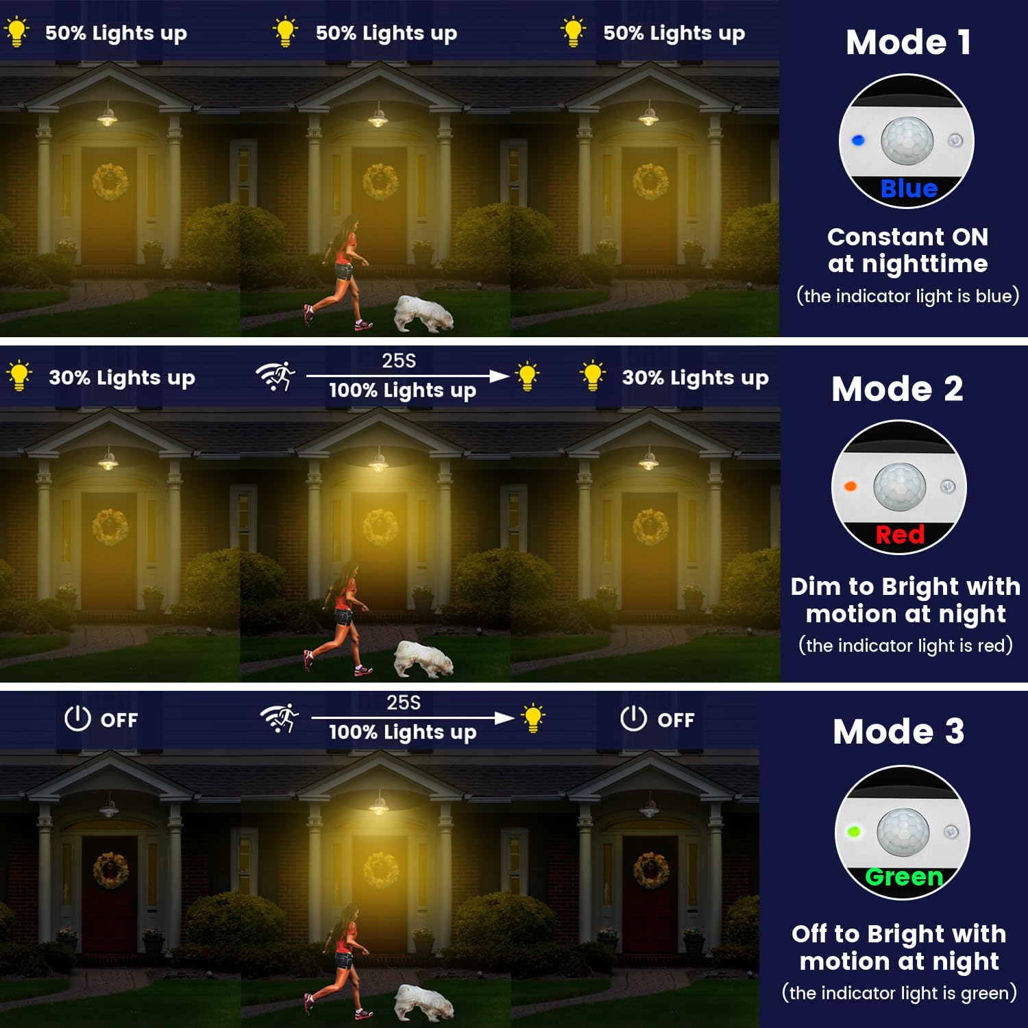 - [3 Modes & 2 Lighting] Choose between warm (3000K) and cool white (6000K) lighting. This farmhouse barn light offers three sensor modes: Constant on, dim to bright, and off to bright. Easily toggle between sensor modes and lighting settings with the "remote" or "mode" button.