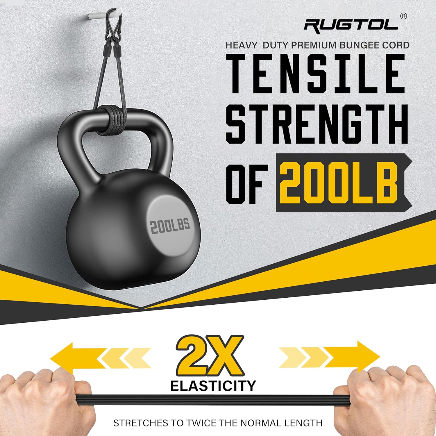 - Super Elasticity and Durability Bungee Cords: Rugtol adjustable bungee cords heavy duty outdoor are made from a UV-resistant, high-quality Thai latex and cross-woven rubber blend, offering superior elasticity that stretches up to 1.7x to 2x its original size. Unlike ordinary rubber bungee cords with hooks, they maintain flexibility without becoming thin or brittle. The rust-resistant carabiner hooks are made with advanced electrophoretic coating technology.
