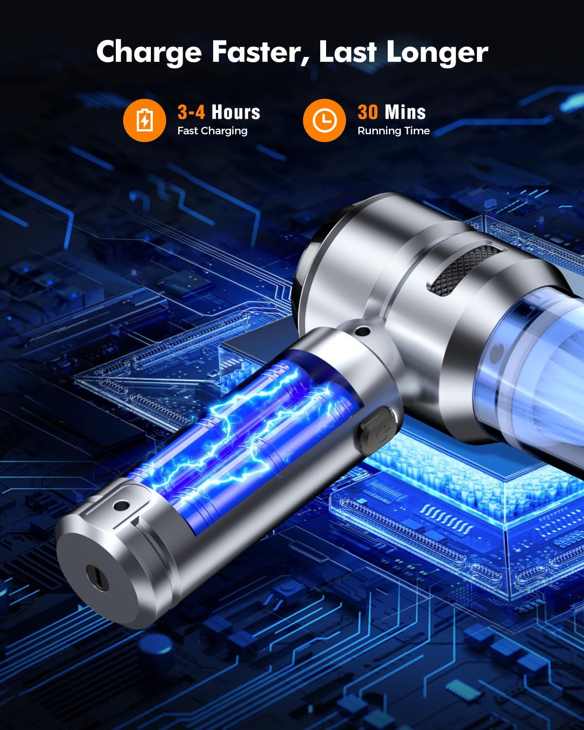 - ă24000PA Powerful SuctionăThis car vacuum portable cordless is equipped with an upgraded powerful high-speed brushless motor, which can reach 110,000RPM in a minute. With 3 adjustable suction modes of 8000PA, 16,000PA and 24,000PA.It can effortlessly deal with all kinds of dust and debris in your car or home.