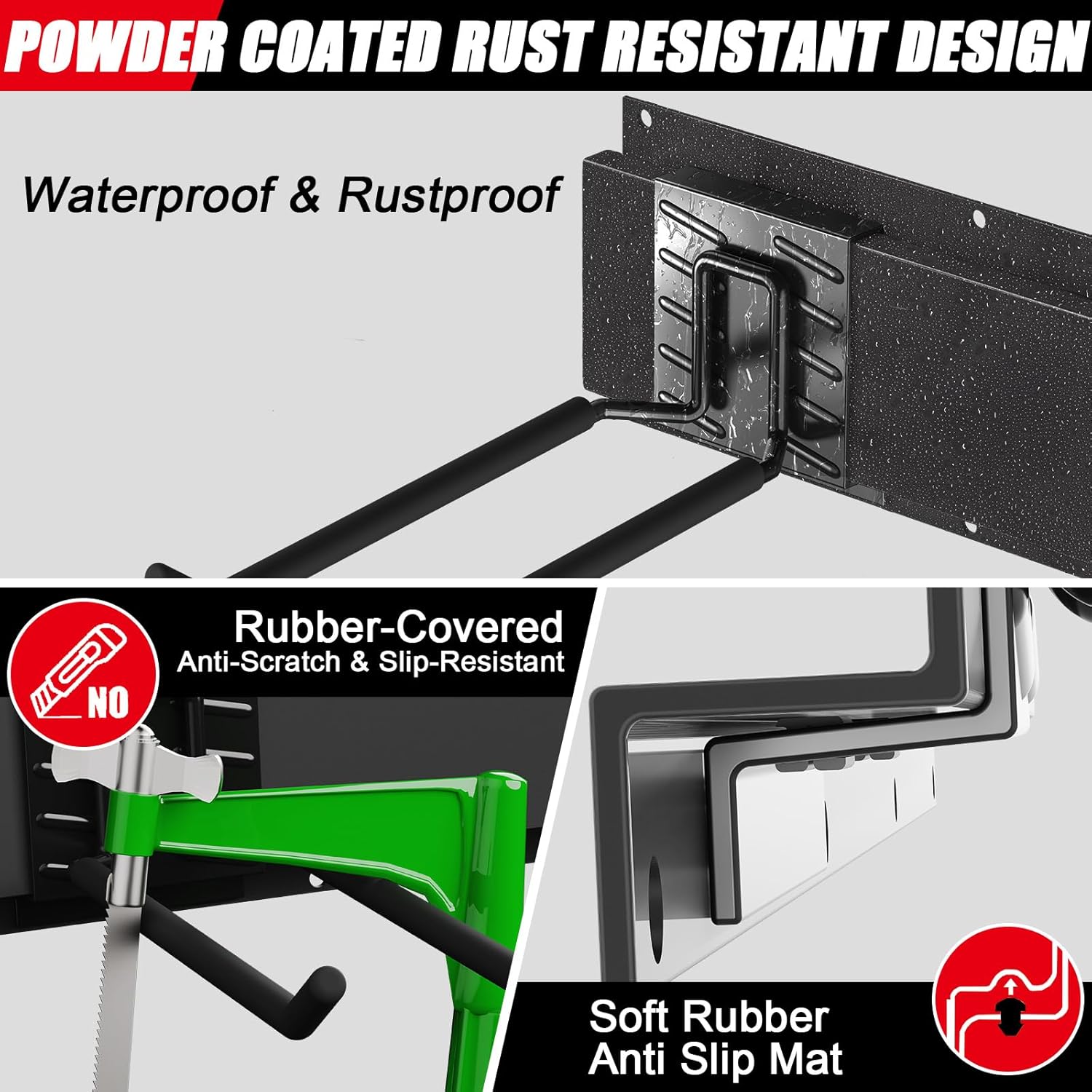 - Heavy Duty & Sturdy: Crafted from premium quality, heavy-duty alloy steel materials, our tool rack boasts an impressive 660 lbs weight capacity – strong enough to hold even your heaviest equipment. The double powder-coated finish resists rust, scratches, while rubber-coated hook arms prevent slipping and protect tool surfaces from dents, long-lasting and sturdy.