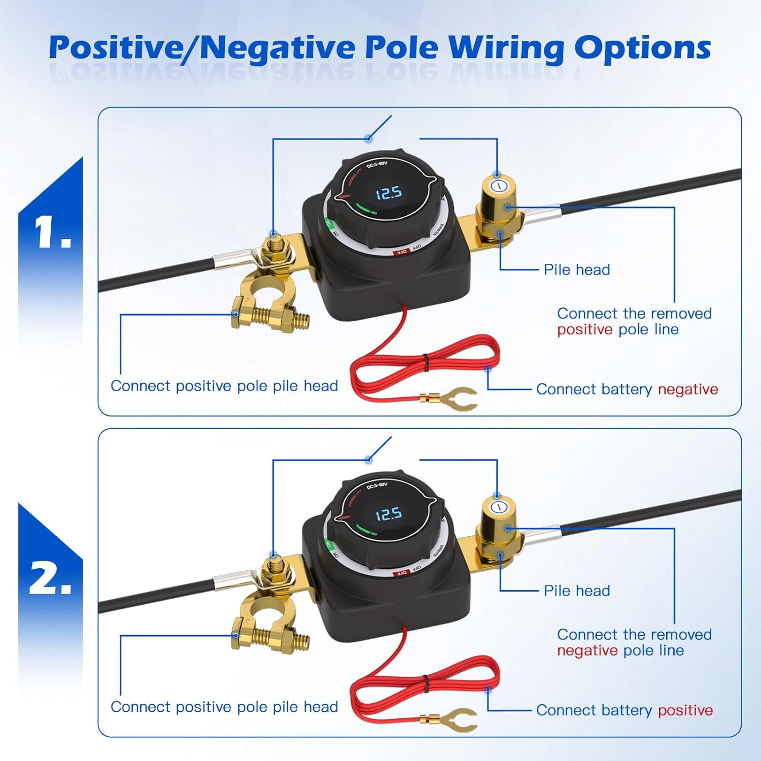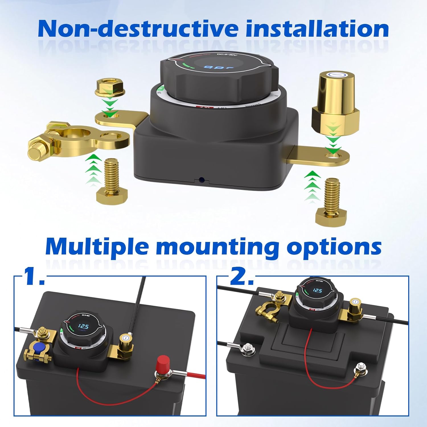 - Real-time LED Voltage Display: With an LED voltage display built into its surface, this top post battery disconnect switch lets you monitor the battery status at a glance. The screen shows real-time voltage when itβs on, and turns off automatically when disconnected