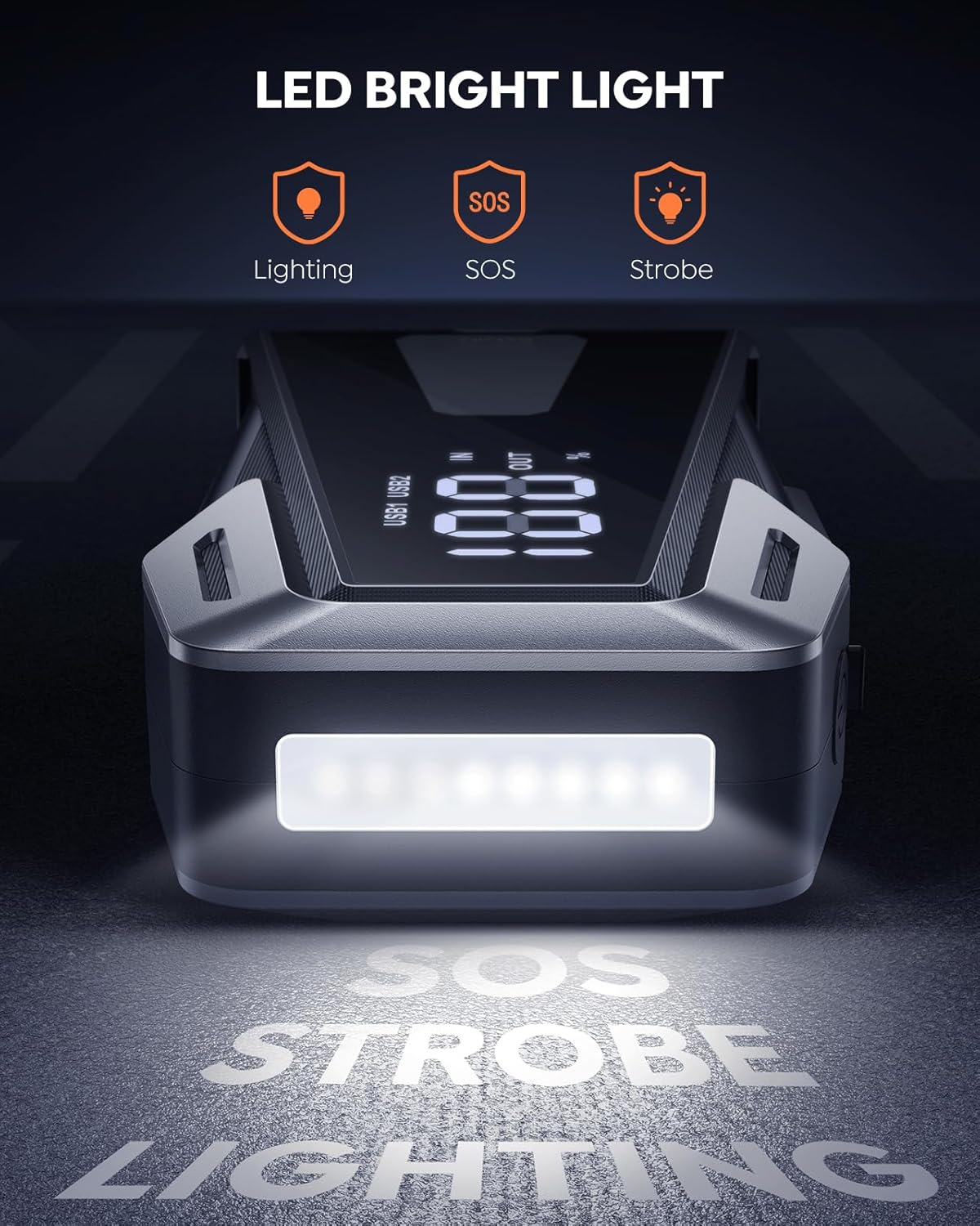 - ăEmergency FlashlightsăThe battery jumper has larger luminous area and utilizes bright LED flashlight with 3 modes (lighting/flash/SOS) under different circumstances and can be used for 48 hours constantly. A battery jumper box for car battery portable comes in handy, will help you find ways in an emergency or on an adventure trip.
