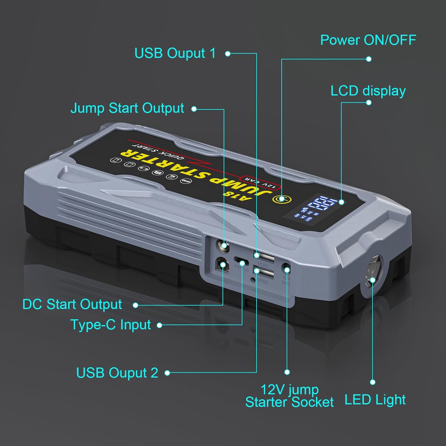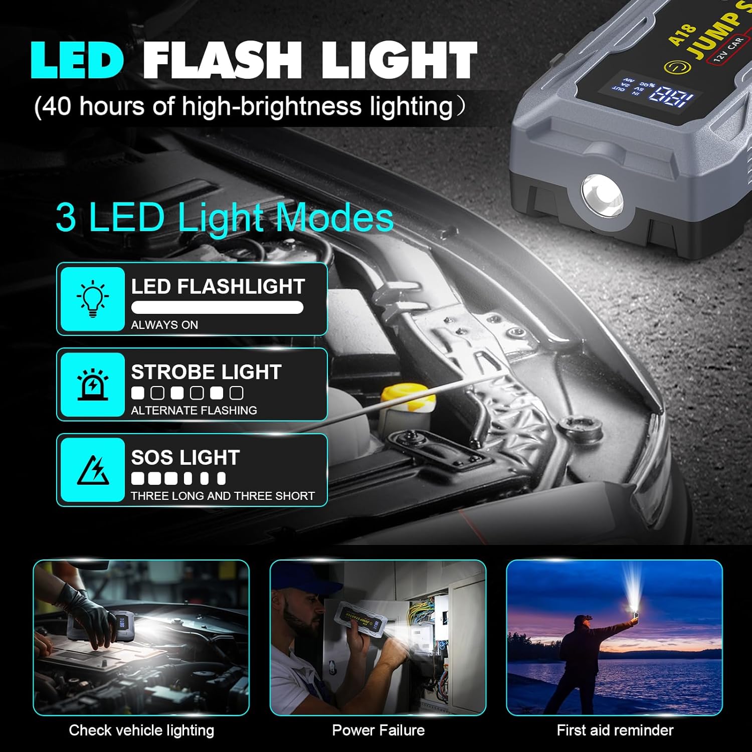 - ăUpgraded 3.0â LCD Display â Real-Time Monitoringă Stay informed with the crystal-clear 3.0â LCD screen, providing real-time battery status, connection instructions, and error alerts. No more guessworkâmonitor your jump starterâs power level and operational status at a glance.
