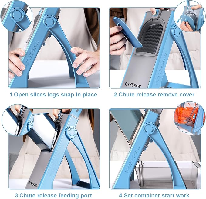 - Read the manual carefully: Please read the instruction manual of the OYKEFAW vegetable chopper closely before use. If you have any questions or issues regarding the Mandolin please do not hesitate to send the seller a message through Amazon and we will respond within 24 hours.