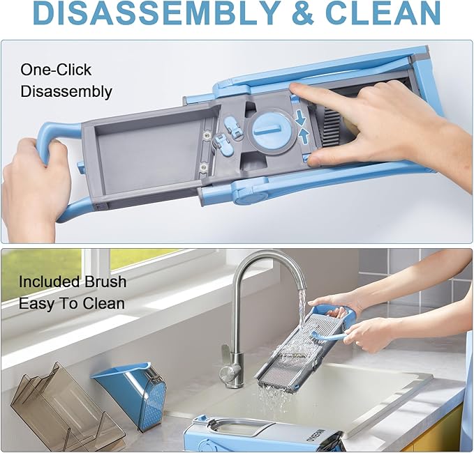 - High Quality & Easy to Use: The food slicer is made of food grade ABS plastic, BPA Free , made of 420 stainless steel blades, no need to change blades, enlarged non-slip silicone base, and the tripod stand is designed to run more stably, 24 months Free replacement, Lifetime after-sales.