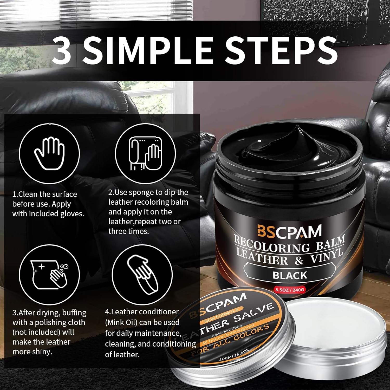 - Leather Repair Kit for Furniture: Our Leather Color Restorer kit with Mink Oil is formulated for quick and easy application, providing comprehensive care for your leather furniture. This Leather Recoloring Balm and Repair Kit is designed to restore leather surfaces to their former glory, enhancing longevity and maintaining a vibrant appearance