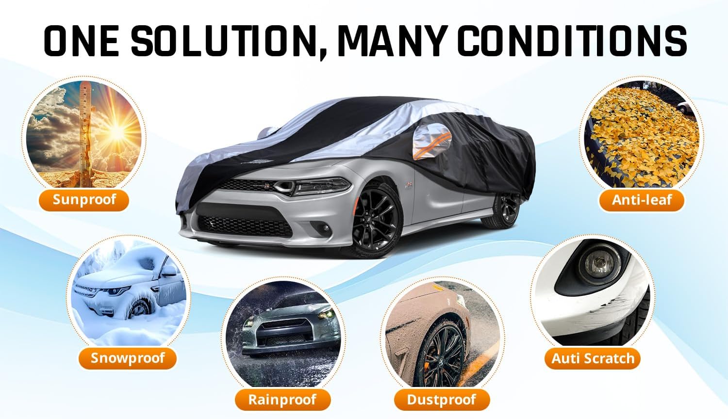 Dodge Charger Car Cover Waterproof All Weather with Silver Strip Design, Custom Fit for Dodge Charger 2006–2023, Charger Accessory with Door Zipper & Windproof Straps