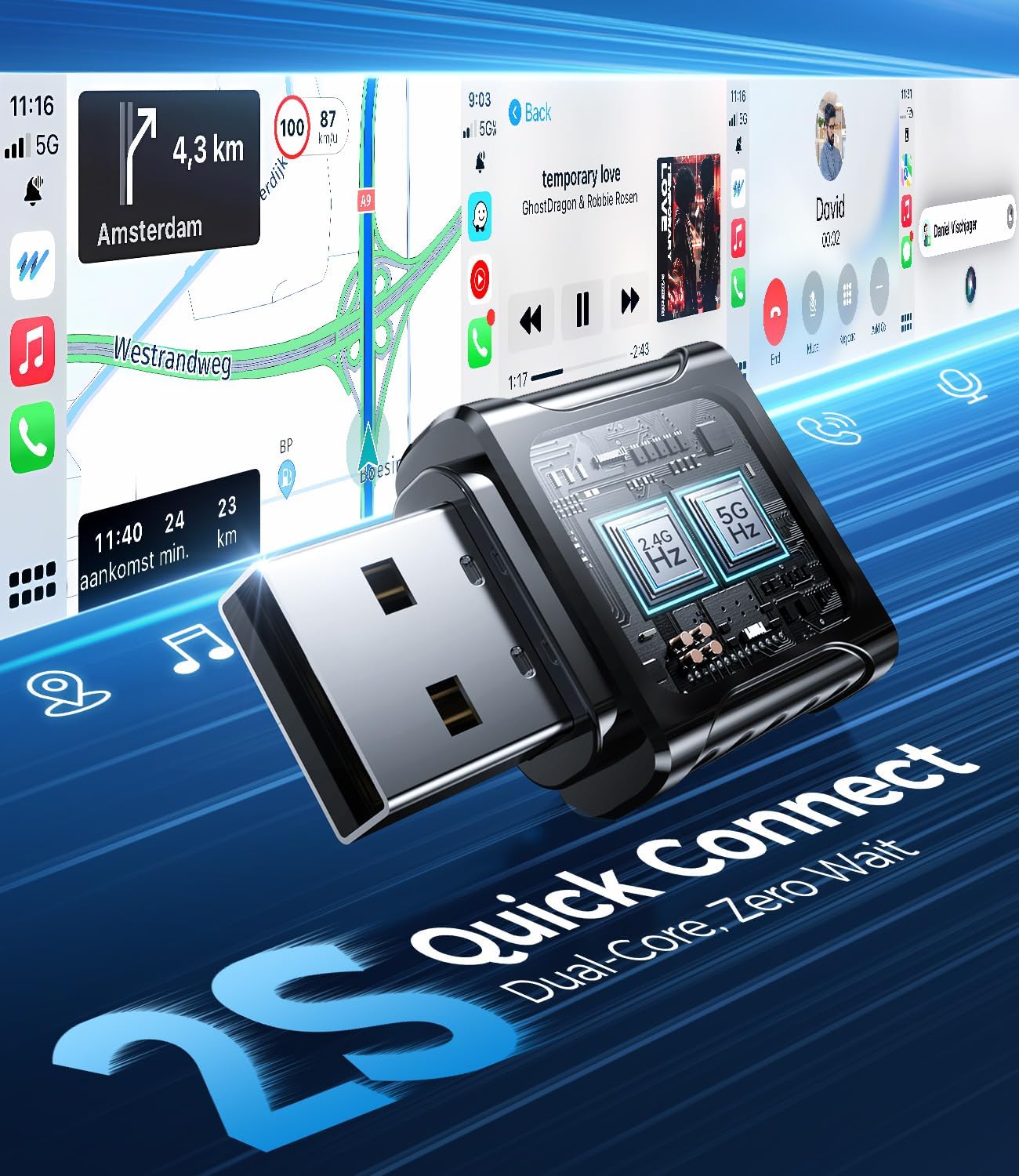 - 🦾【Effortless Plug & Play: Your Always-Ready CarPlay】Simply set up in minutes with just three steps—no extra apps or drivers. Once paired, your CarPlay wireless adapterautomatically greets you at ignition, transforming rushed mornings. Coffee in hand, phone buried in your work bag? CarPlay connects before you buckle up, delivering ultimate convenience from the first turn of the key. Enjoy seamless Apple CarPlay, free from daily re-plugging to truly set-and-forget.