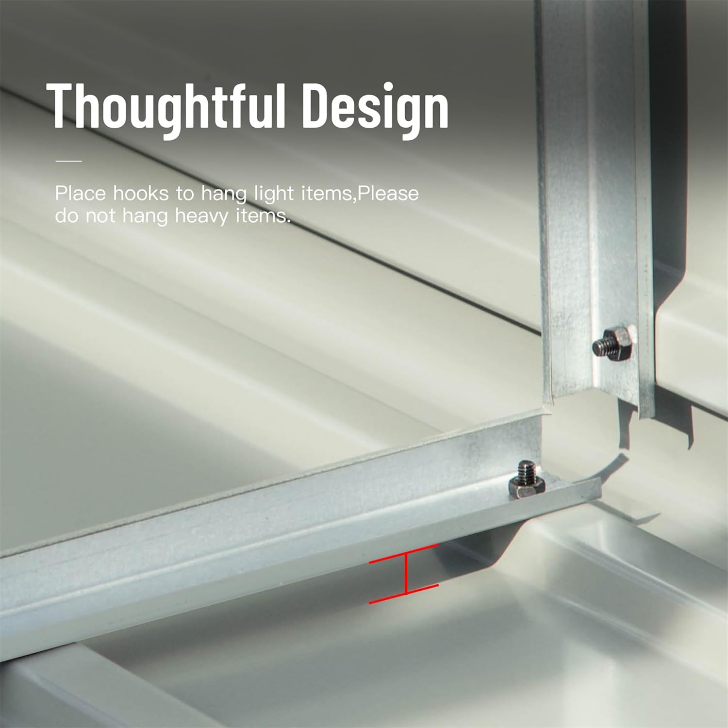 - Durable Galvanized Steel Frame for Long-Lasting Use Constructed with premium galvanized steel. The powder-coated surface enhances durability while maintaining a sleek aesthetic. Ideal for high-humidity or rainy regions, it withstands decade-long use without warping—perfect for storing tools, gardening equipment, or seasonal items.