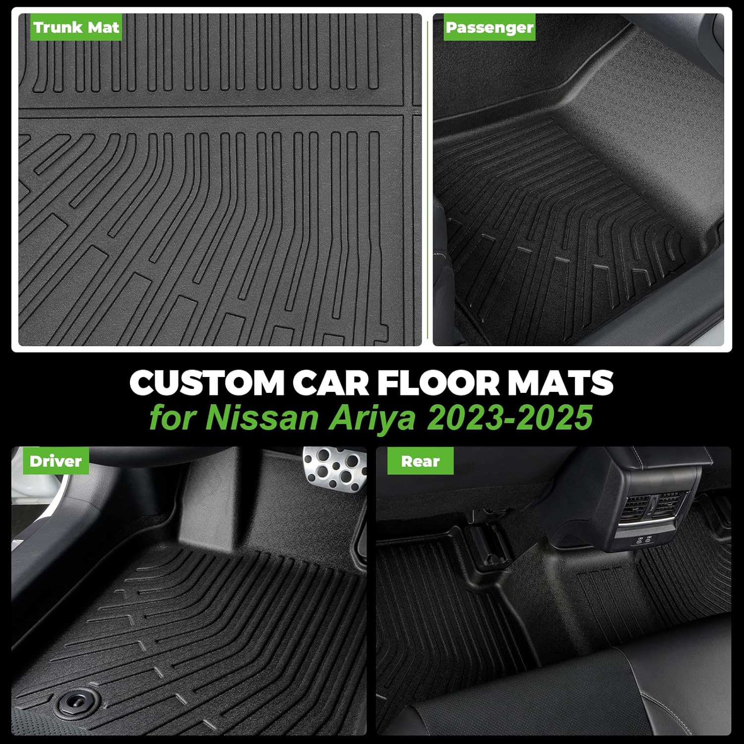 - ăPrecise FităSuitable for Nissan Ariya 2023-2025 all-weather floor mats and cargo mats. Through 3D laser scanning technology, accurately cover your car carpet and fit your car like a glove. During the design process, attention was paid to details such as throttle and brakes, which will not affect your driving experience.