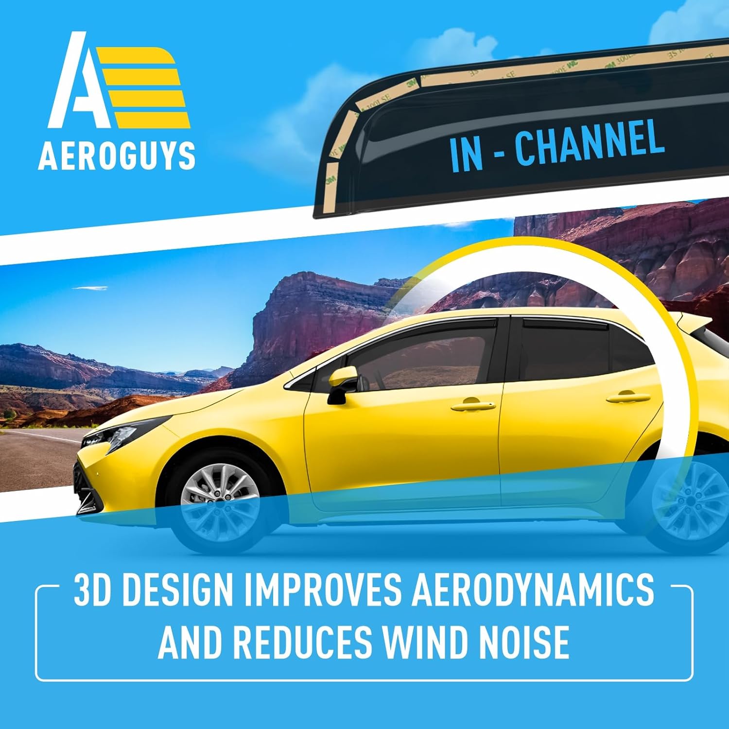 - No Tools Needed, Quick and Easy Assembly β These rain guards are very easy to fit. IN-CHANNEL INSTALLATION provides perfect fit for your car. Just slip it onto your carβs window and your job is done within minutes. There is no drilling or no tools required. Be sure that AEROGUYS window deflectors are water resistant, sun protective and will not bend, break or crack regardless of the weather conditions.