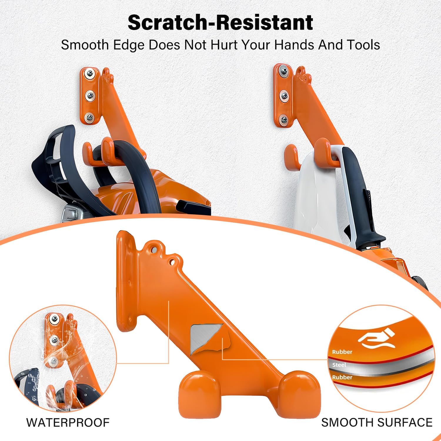 - Protects Your Tools: With an orange rubber coating, the chainsaw rack protects your saw's handle from damage and prevents rust. This thoughtful design ensures your equipment stays in top condition, while providing additional protection during storage. 3-Hole chainsaw wall mount, industrial-grade anti-rust coating and pre-drilled holes ensure a secure grip (screws included)