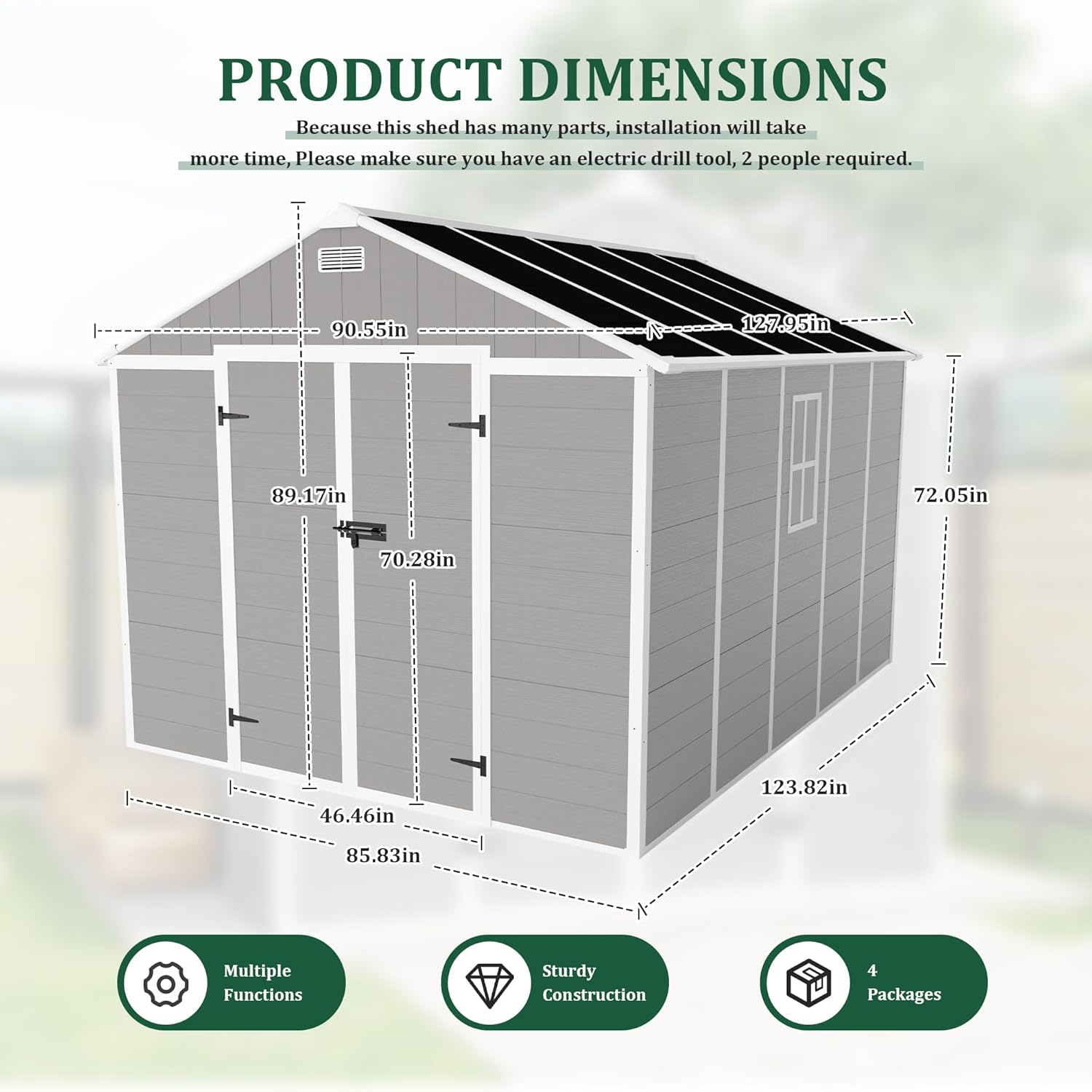 MyVoice 10x8 FT Outdoor Resin Storage Shed with HD Window, Rustproof Waterproof Garden Tool Shed, 12mm Thickened PP Panels, Large Capacity Outdoor Utility House for Backyard Patio (with Floor)