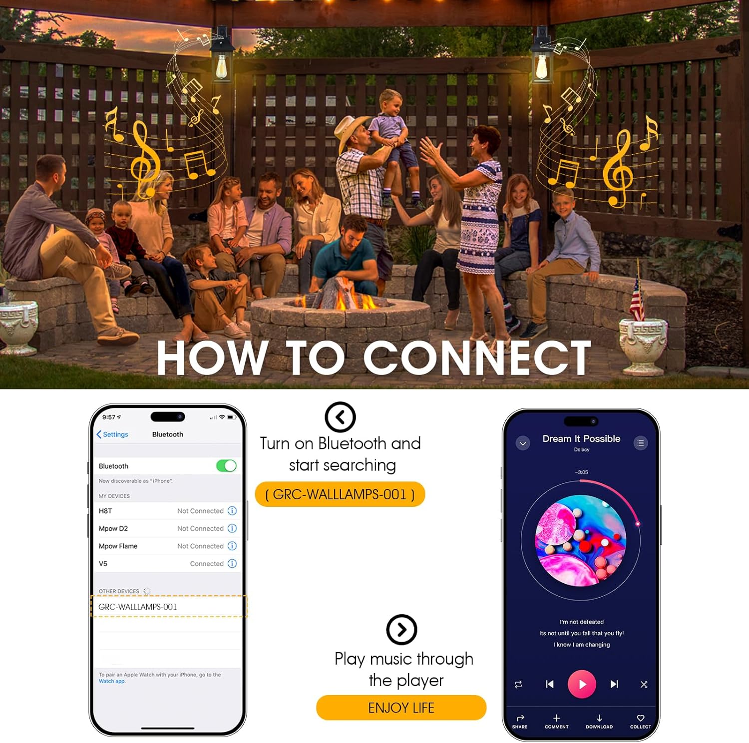 - 【Built-in Bluetooth Speaker Outdoor Wall Light】 This outdoor wall light features a weatherproof Bluetooth speaker seamlessly integrated into its design. Rotate the speaker 180° to direct sound across your patio, porch, or garage. Stream music directly from your phone – perfect for garden parties, BBQs, or relaxing in your outdoor space